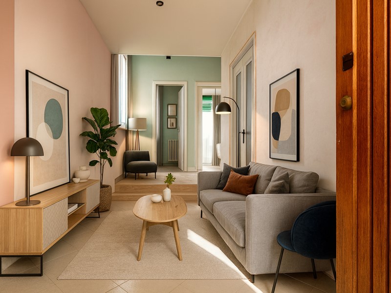 Varcando la piccola corte privata all'ingresso, si percepisce subito quella sensazione di indipendenza e praticità che molte persone oggi cercano. Entrando trovi un corridoio funzionale che distribuisce gli ambienti in modo ordinato: sulla destra la zona cucina, perfetta da ridisegnare secondo i propri gusti.