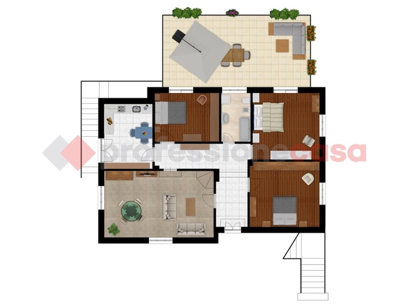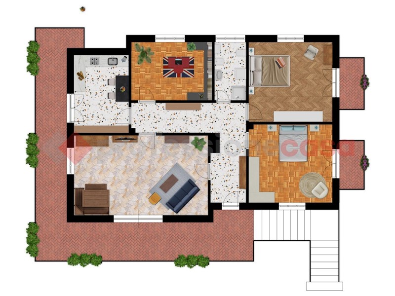 Con accesso diretto dal giardino, l'appartamento al piano terra è composto da ingresso su pratico corridoio, ampio soggiorno, cucina abitabile, tre camere da letto e un bagno finestrato con vasca. Completa il piano uno splendido terrazzo di circa 50 mq, accessibile da due camere, perfetto per rilassarsi all'aperto e godere del silenzio e del paesaggio circostante