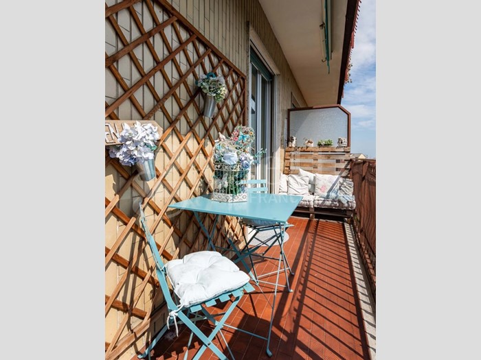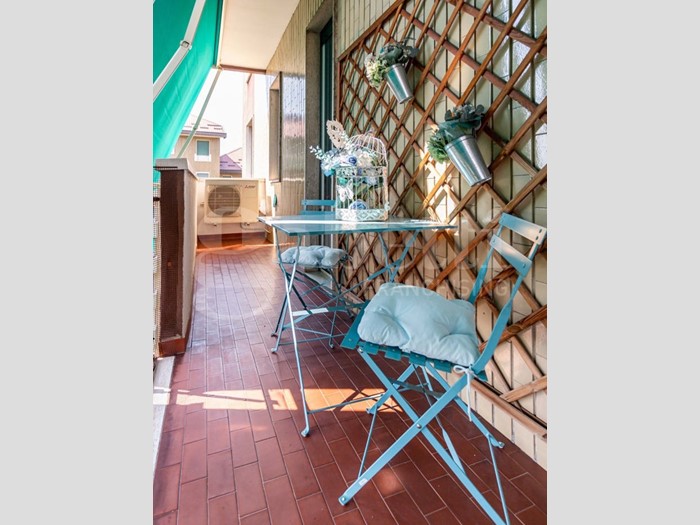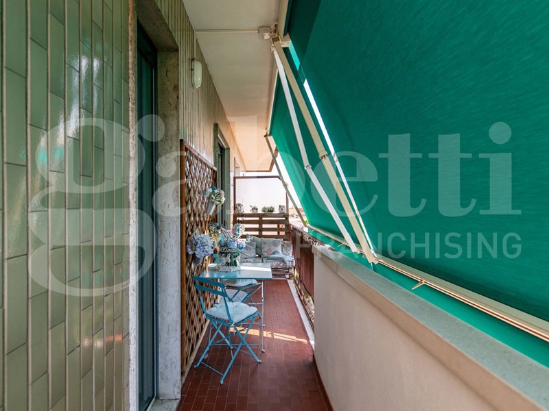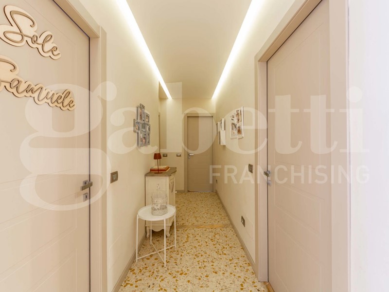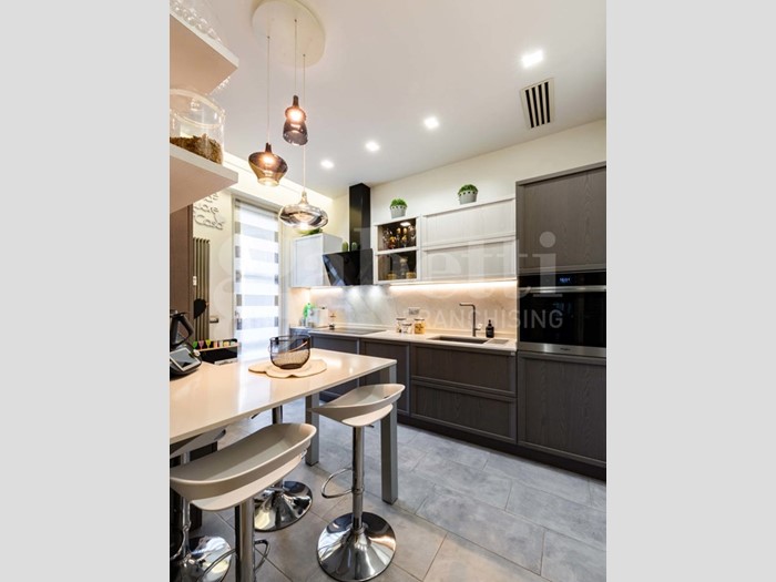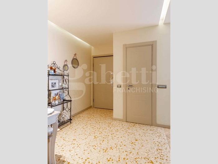 L'ingresso accoglie con controsoffittature LED, che accompagnano verso un soggiorno davvero grande, elegante e molto luminoso, con uscita sul balcone lungo con vista aperta.