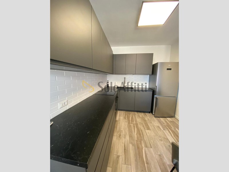 Appena varcata la porta blindata, l’ingresso introduce in un luminoso soggiorno con cucina a vista, elegantemente separato da una paretina che regala privacy e continuità agli spazi. La cucina, realizzata con finiture di alta qualità, si apre sulla zona living, calda e accogliente grazie al parquet e alle tonalità armoniose dell’arredo.