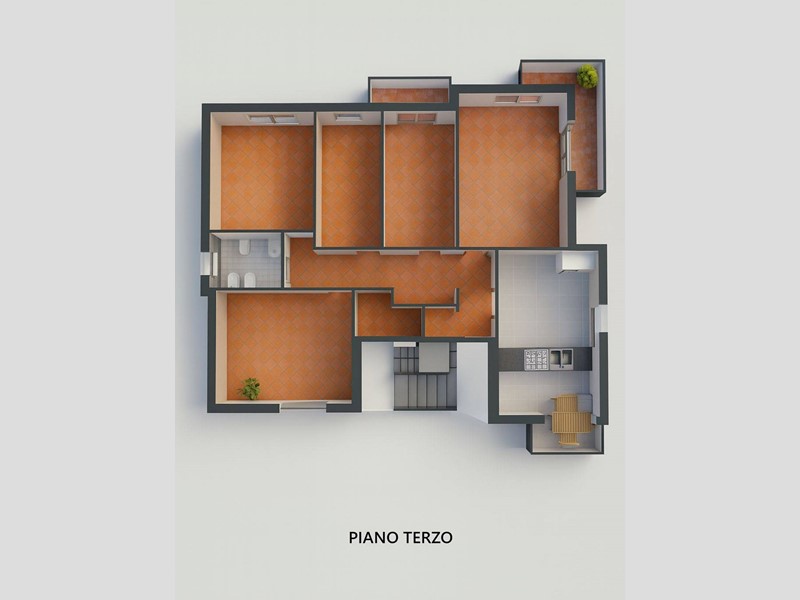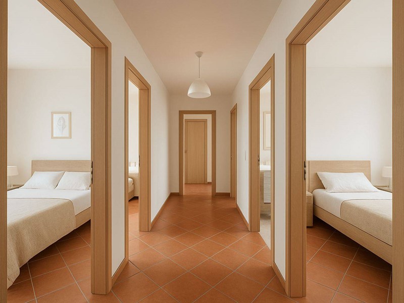 Dispone di 6 vani complessivi, tra cui 5 spaziose camere da letto, 2 bagni, 3 terrazzi e cucina abitabile.