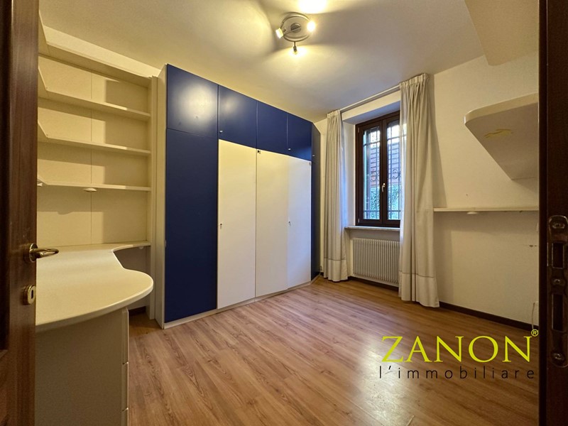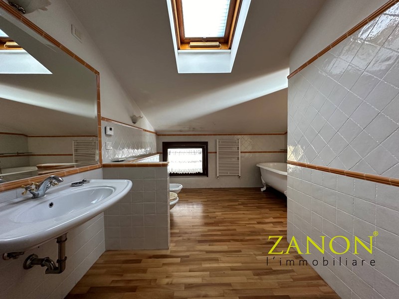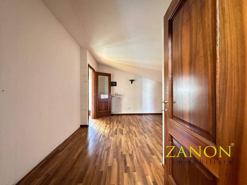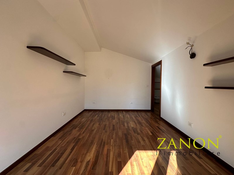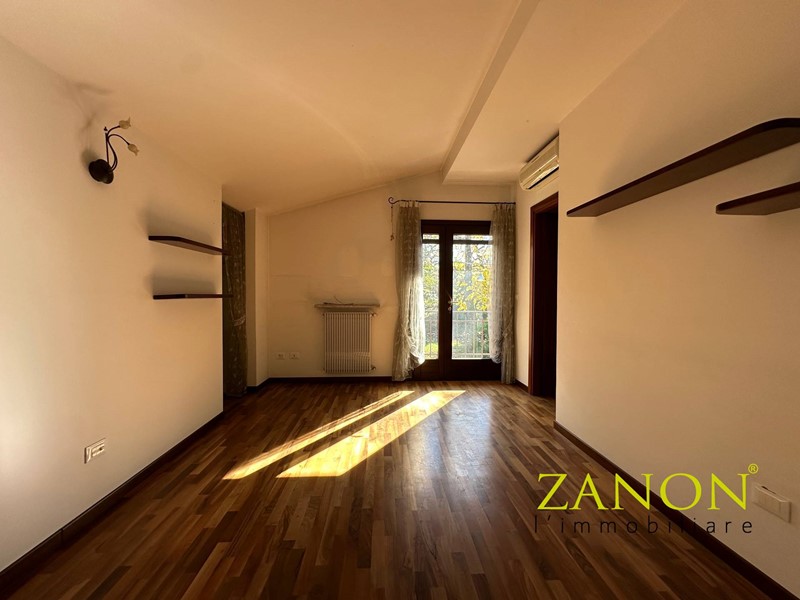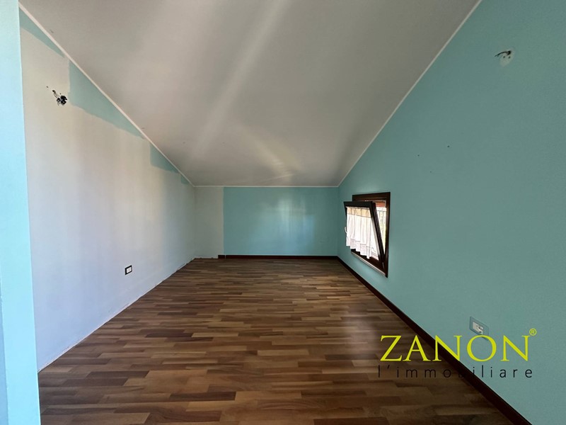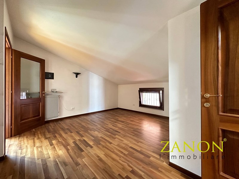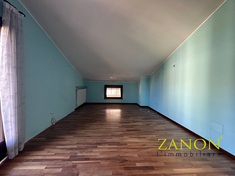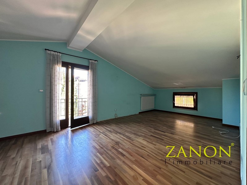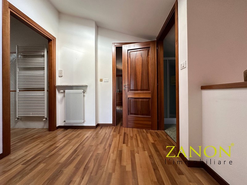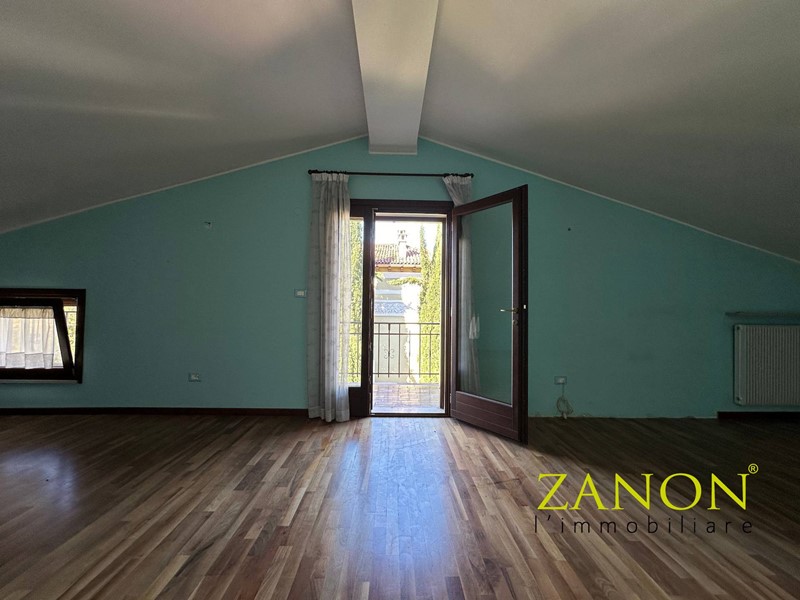 Unelegante scala conduce al piano superiore, dove si sviluppa la zona notte. Un disimpegno distribuisce in maniera ottimale gli spazi, conducendo a una camera da letto con un ulteriore ambiente adatto a cabina armadio o studio, completata da un terrazzo di 6 mq con affaccio sul giardino.