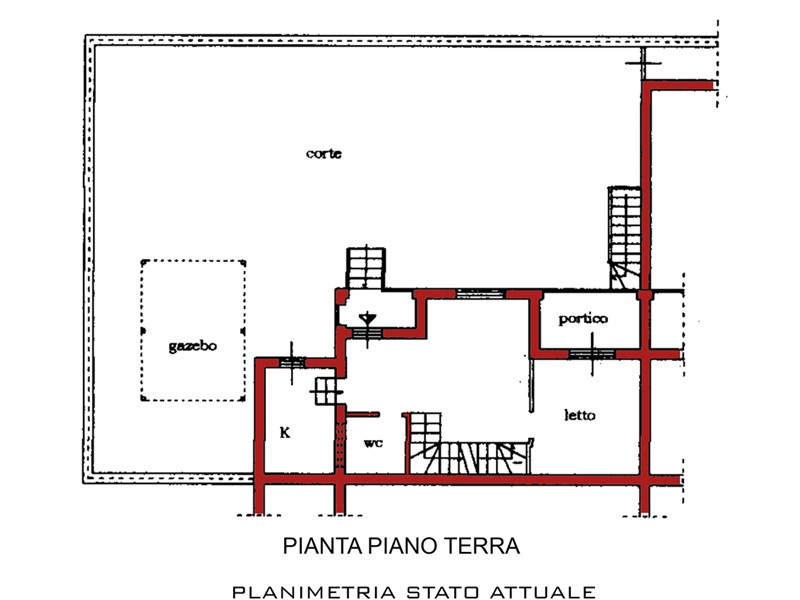 piano terra: giardino privato, ingresso, soggiorno, cucina, camera da letto, bagno e altra cucina.