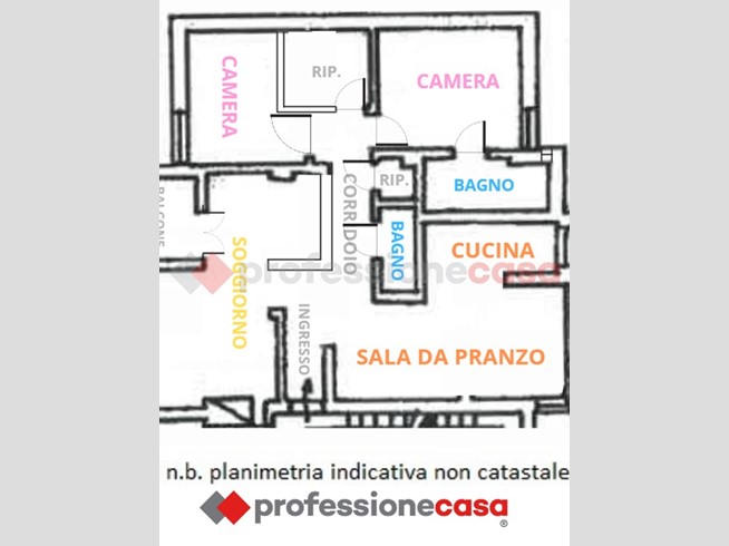 L'appartamento è composto da un como ingresso, soggiorno molto ampio, sala da pranzo e cucinotto, due camere da letto, due comodi ripostigli, due bagni e un balcone.