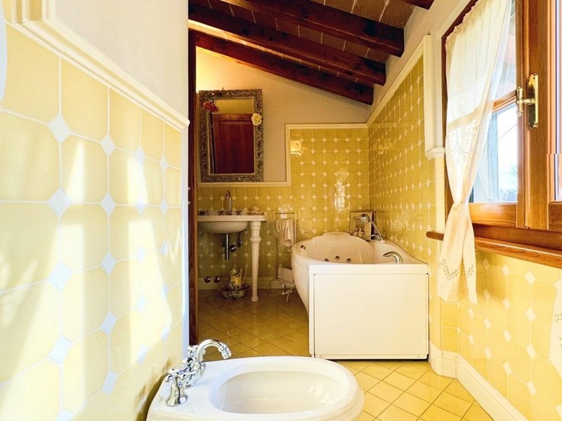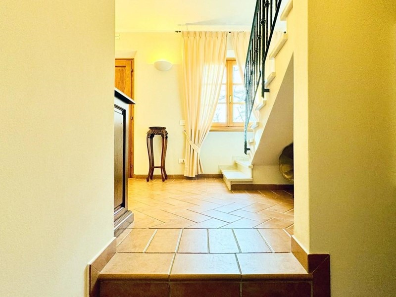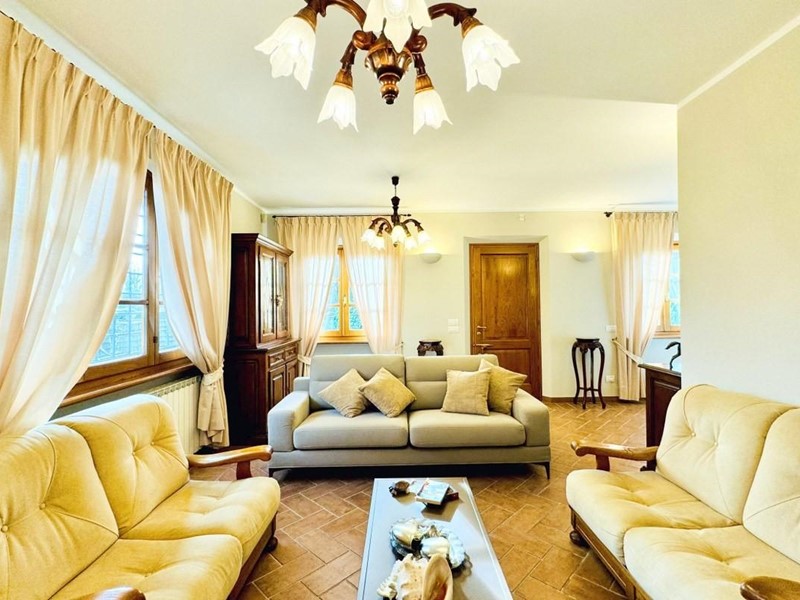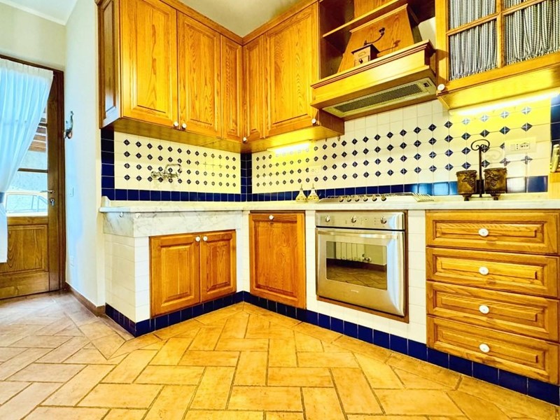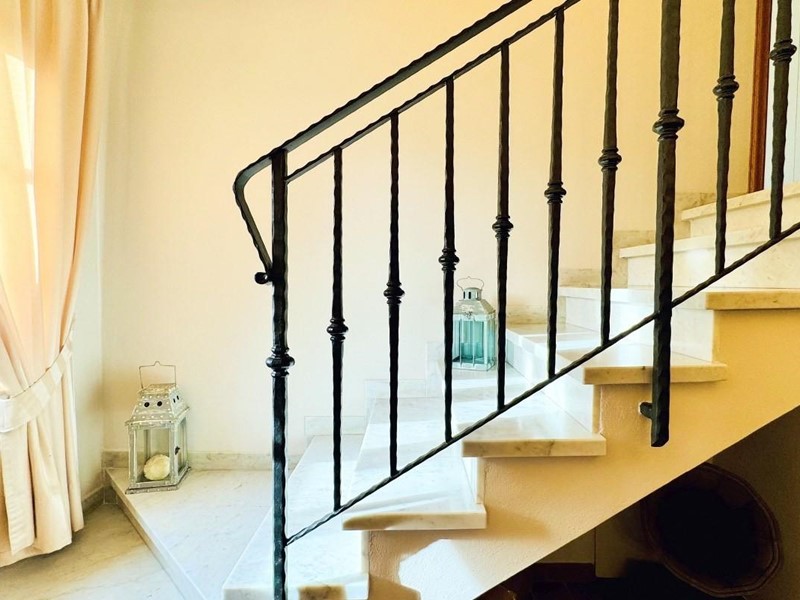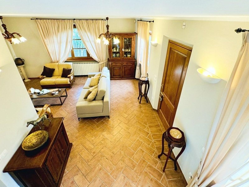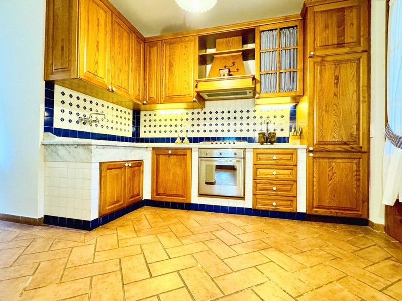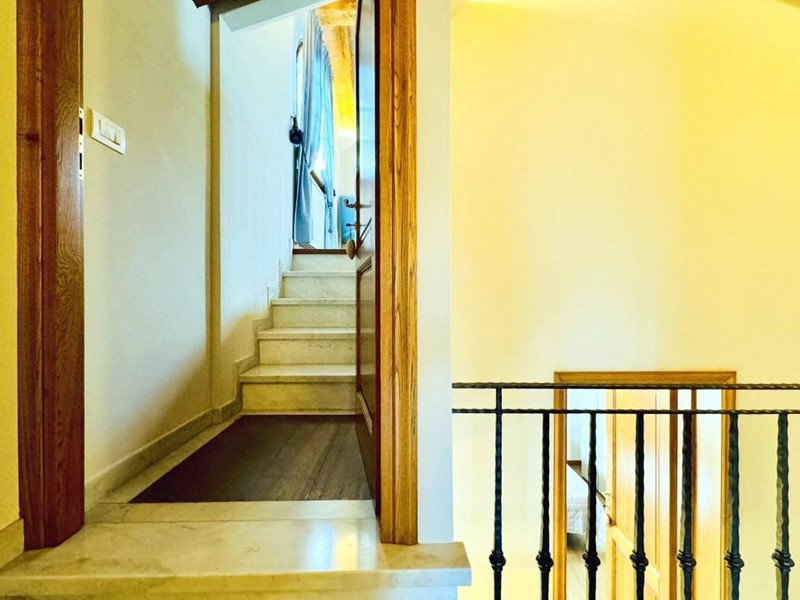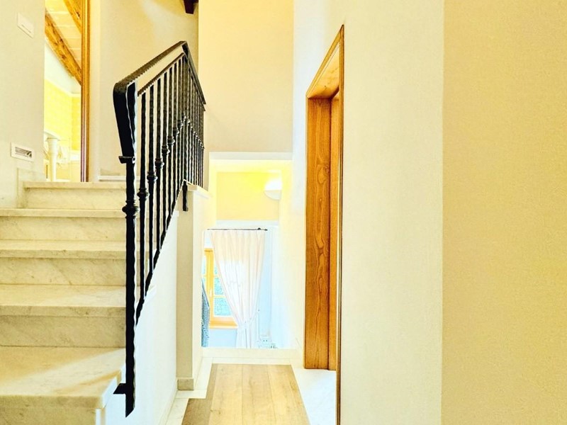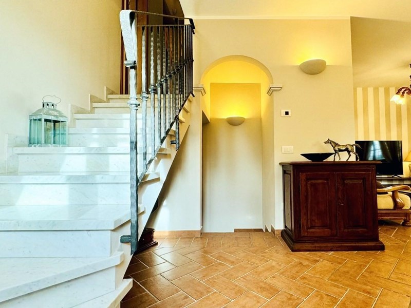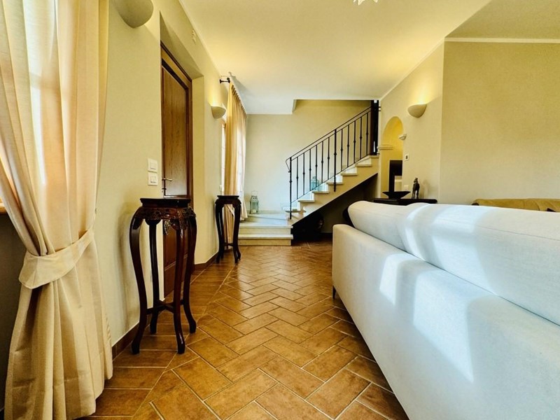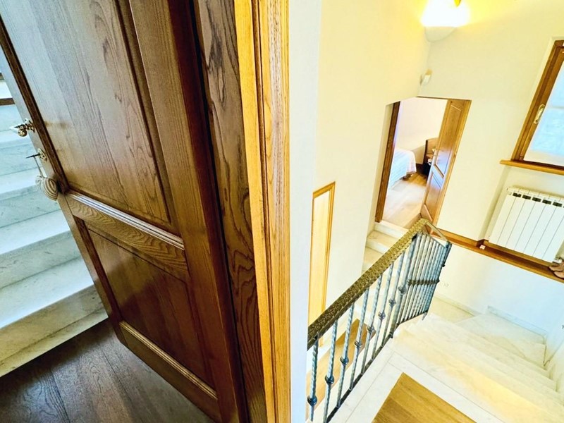 L'ingresso principale alla villa avviene a piano terreno rialzato e più precisamente nel generoso soggiorno. Percorrendo il disimpegno si raggiunge la cucina abitabile (con lavastoviglie) ed il primo bagno con doccia posti, entrambi sono a piano terreno. Fuoriuscendo dalla porta a finestra del cucinotto si fruisce di un piacevole portico riservato che domina il giardino. Attraverso la scala in marmo si sale ai piano superiori dove trova posto la zona notte. Le camere da letto sono quattro (2 matrimoniali e 2 doppie). Gli ospiti che possono esser ospitati sono 8. I bagni al servizio degli abitanti a questo livelli sono due, uno con doccia ed uno con vasca jacuzzi.