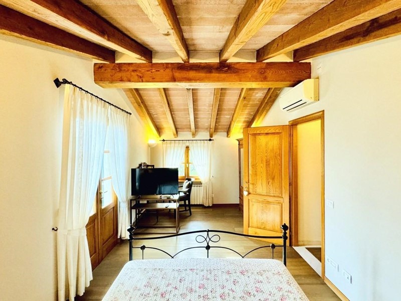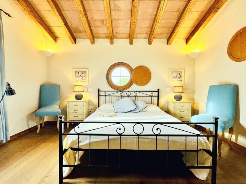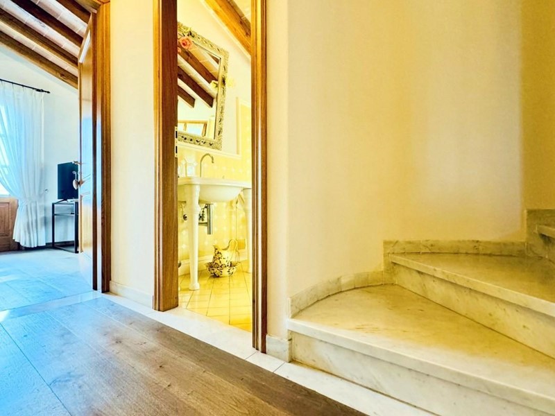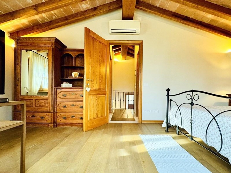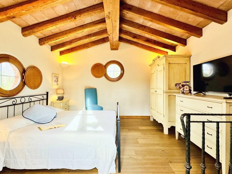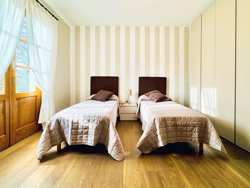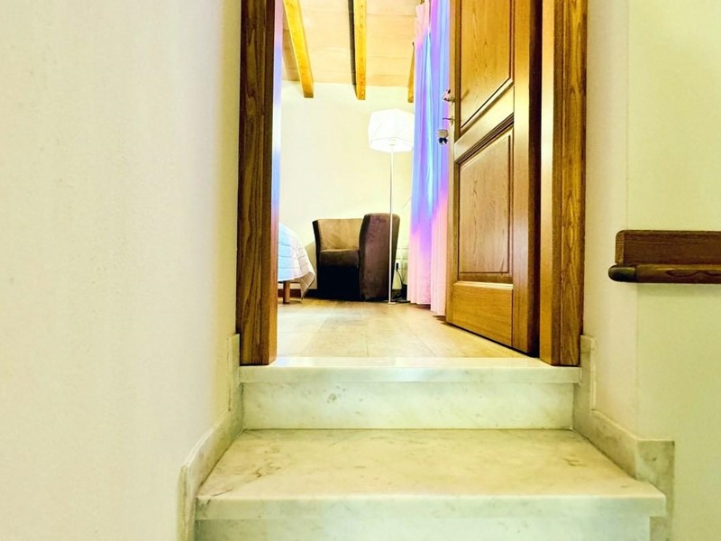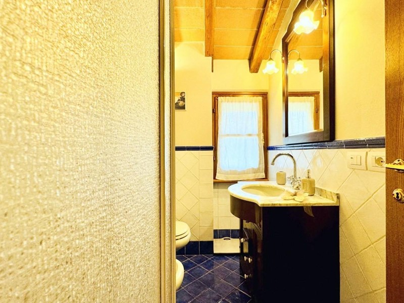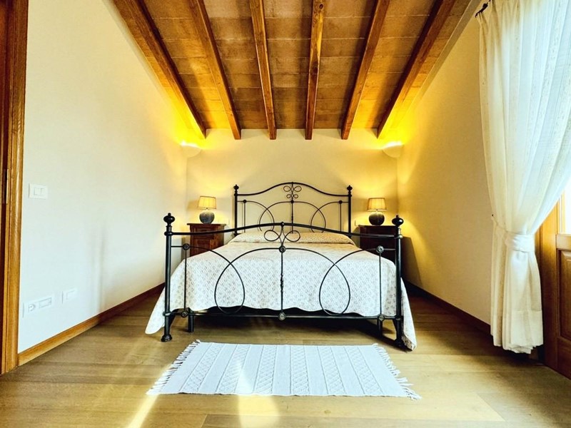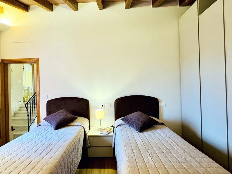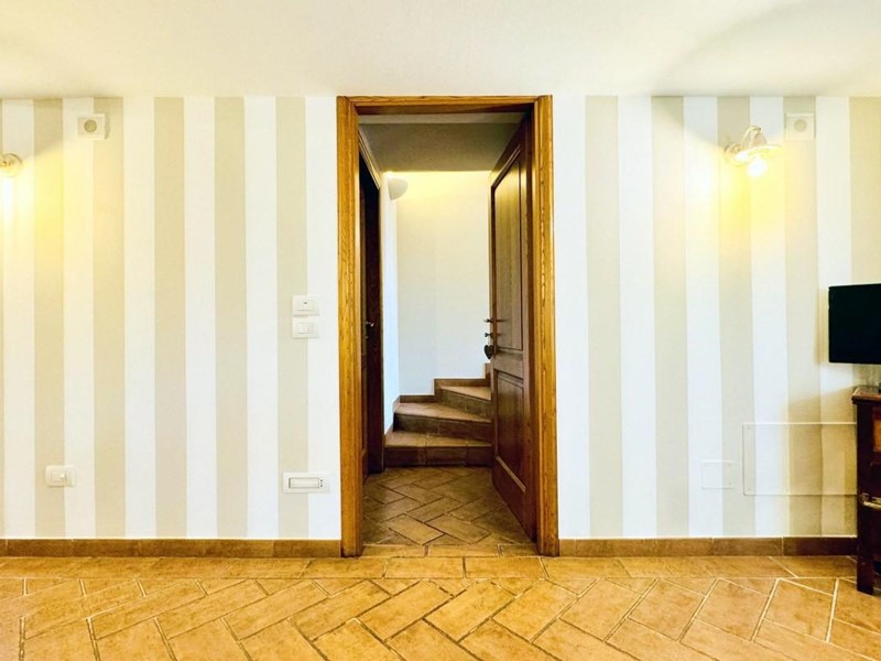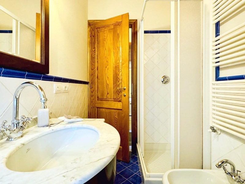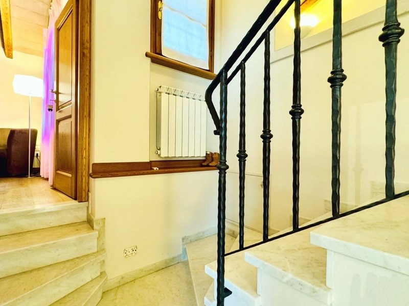 L'ingresso principale alla villa avviene a piano terreno rialzato e più precisamente nel generoso soggiorno. Percorrendo il disimpegno si raggiunge la cucina abitabile (con lavastoviglie) ed il primo bagno con doccia posti, entrambi sono a piano terreno. Fuoriuscendo dalla porta a finestra del cucinotto si fruisce di un piacevole portico riservato che domina il giardino. Attraverso la scala in marmo si sale ai piano superiori dove trova posto la zona notte. Le camere da letto sono quattro (2 matrimoniali e 2 doppie). Gli ospiti che possono esser ospitati sono 8. I bagni al servizio degli abitanti a questo livelli sono due, uno con doccia ed uno con vasca jacuzzi.