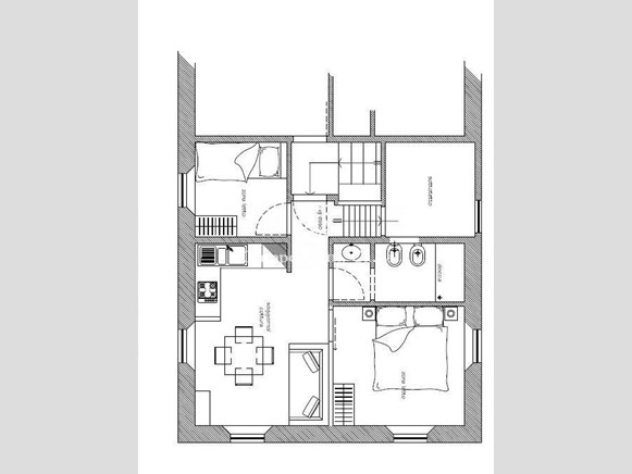 Internamente è composto da ingresso, luminoso soggiorno con zona pranzo e angolo cottura, una camera matrimoniale, una camera singola e un bagno con doccia. Completano la proprietà un pratico sottotetto ad uso ripostiglio e una stanza lavanderia/cantina posta al piano mezzanino.