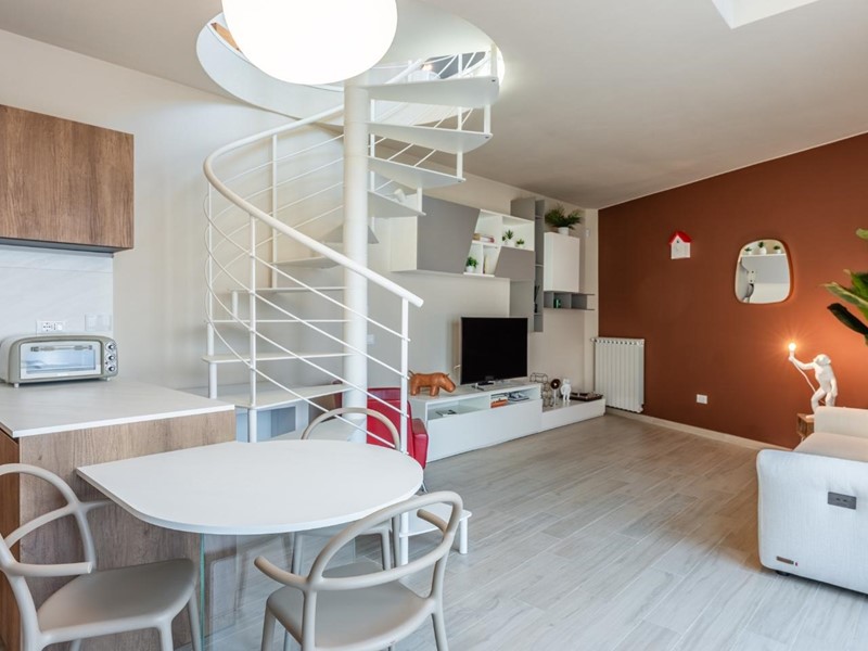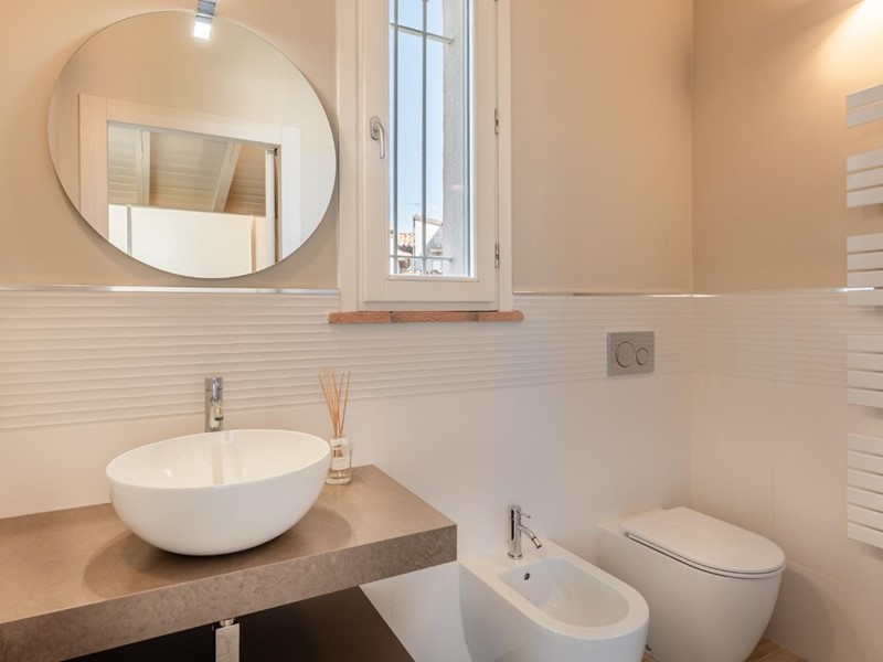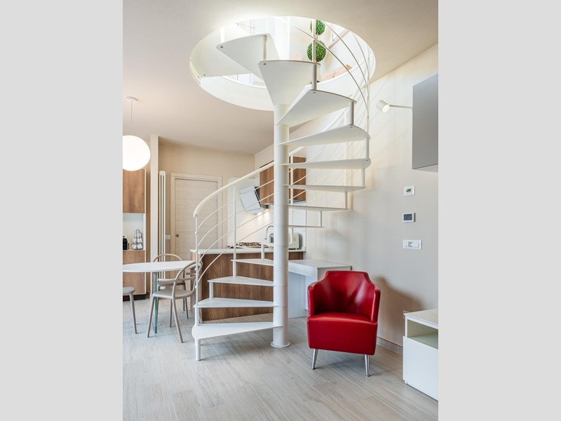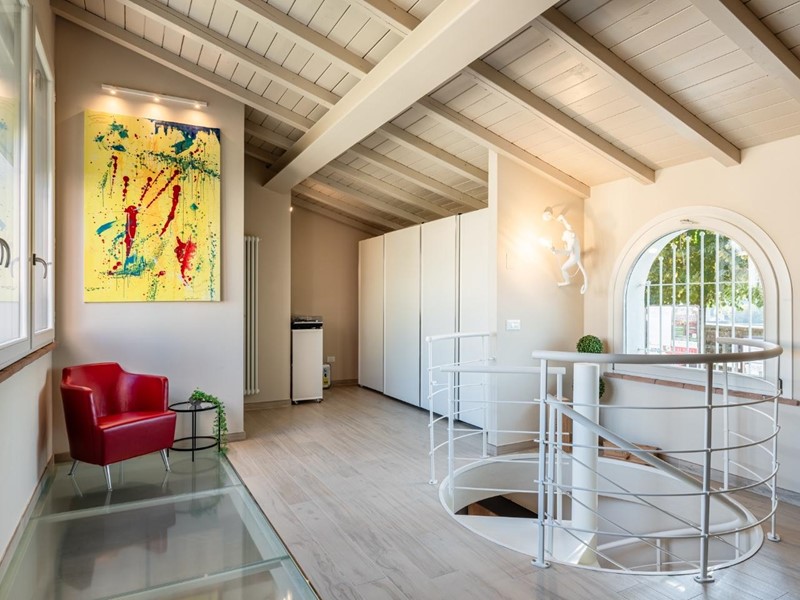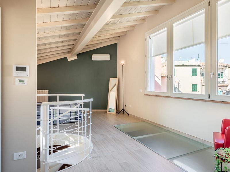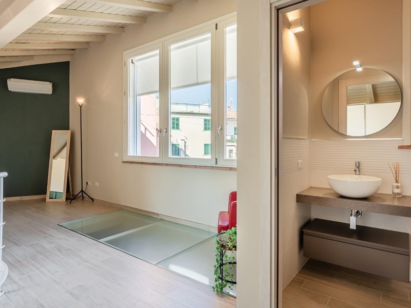 • Piano primo: elegante scala elicoidale di design conduce alla zona notte composta da una camera matrimoniale con spettacolare vetrata panoramica sulla Torre degli Upezzinghi, spazio pluriuso (ideale come studio) e bagno padronale.
