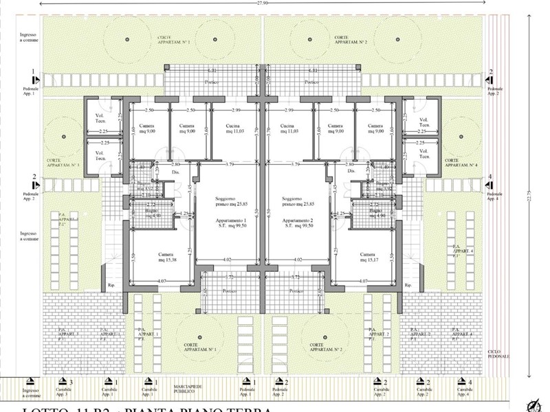 Cecina Marina: Vendesi appartamenti di nuova realizzazione all'interno di un nuovo contesto di moderna Lottizzazione, dove troviamo parcheggi, spazi verdi, piste ciclabili e percorsi pedonali che permettono di raggiungere comodamente il mare e il centro città. Gli appartamenti sono INDIPENDENTI, con giardini in proprietà Esclusiva, oltre a n.2 posti auto e locale ripostiglio al piano terreno. Il fabbricato è composto da appartamenti di 100 mq - con 2 unità al piano terreno e 2 unità al piano primo. E' possibile ampliare la superficie fino a 125 mq. Oppure realizzare un Trilocale di 75 mq. La soluzione al PIANO TERRENO ha il giardino d'ingresso, il porticato, con vetrata di accesso al soggiorno + cucina con uscita sul secondo portico e giardino sul retro completo di veranda, oltre a reparto notte con tre camere e doppi servizi. Al PIANO PRIMO si accede da scala esterna, passando per la comoda terrazza, con entrata in soggiorno per proseguire in cucina - pranzo, completa di terrazza. Il reparto notte, è composto da disimpegno, bagno di servizio e ripostiglio, tre camere, secondo bagno e due terrazze.
