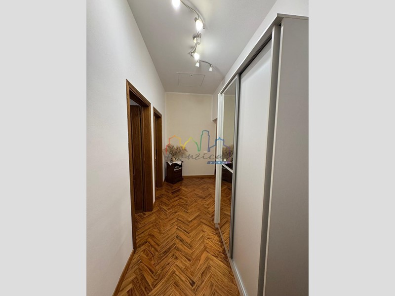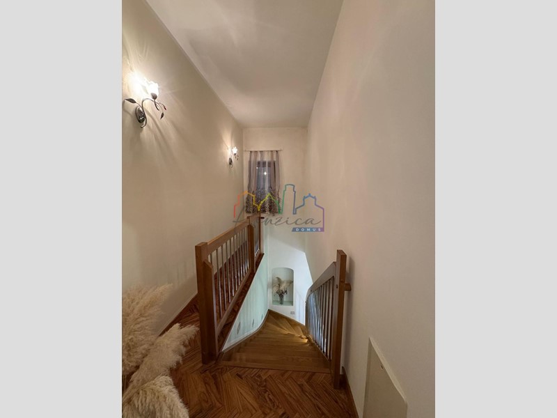 Una elegante scala a giorno conduce al piano superiore, dove si sviluppa la zona notte. Qui trovano spazio due ampie camere matrimoniali rifinite con parquet, calde e raffinate, oltre a un secondo bagno anch’esso finestrato, a servizio della zona notte.