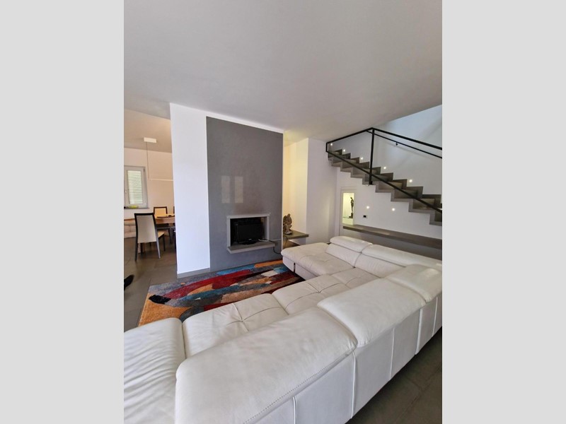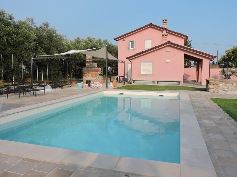 R 37. Molicciara - Castelnuovo Magra, Vendesi prestigiosa villa di lusso di circa 150 mq più 50 mq. di dépendace. La villa è immersa in un terreno di circa 2000 mq dotata di grande piscina illuminata con cascata, Il corpo principale della villa è costituito da: P.t. ingresso su lussuoso salone doppio con camino, ampia sala da pranzo, bagno con doccia, cucina abitabile con soffitto alto e travi a vista; Piano primo: camera matrimoniale, studio, seconda camera, bagno con vasca idromassaggio e finestra; Dalla cucina abitabile, con scala comoda, si accede alla grande taverna dotata di camino con ampio soggiorno, cantina attrezzata, ripostiglio e locale tecnico. Nella parte esterna la fa da padrone la grande piscina immersa nel curato giardino, la dépendance con spazioso portico e un pozzo. La villa viene venduta completa di arredo di design, dotata di panelli solari, climatizzatore , video sorveglianza, Riscaldamento a pavimento. Rifiniture di lusso