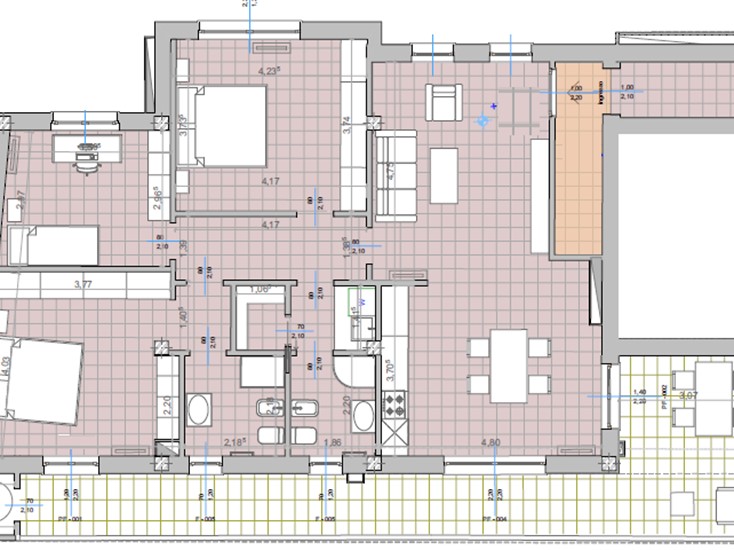 L’immobile è così composto: ingresso, ampio soggiorno, cucina, disimpegno notte, due ampie camere matrimoniali, una camera media e due bagni. La zona giorno si affaccia sulla TERRAZZA abitabile angolare, parzialmente coperta a loggia, di circa mq 22.