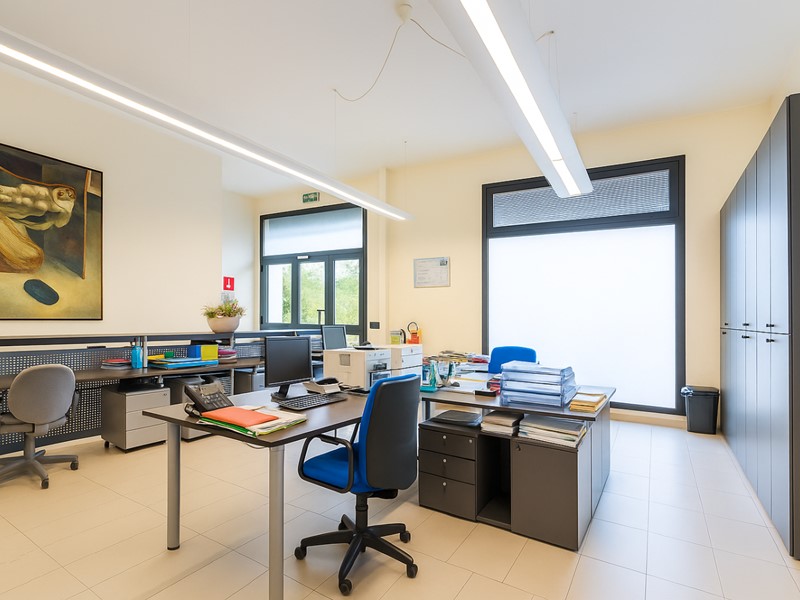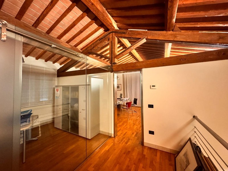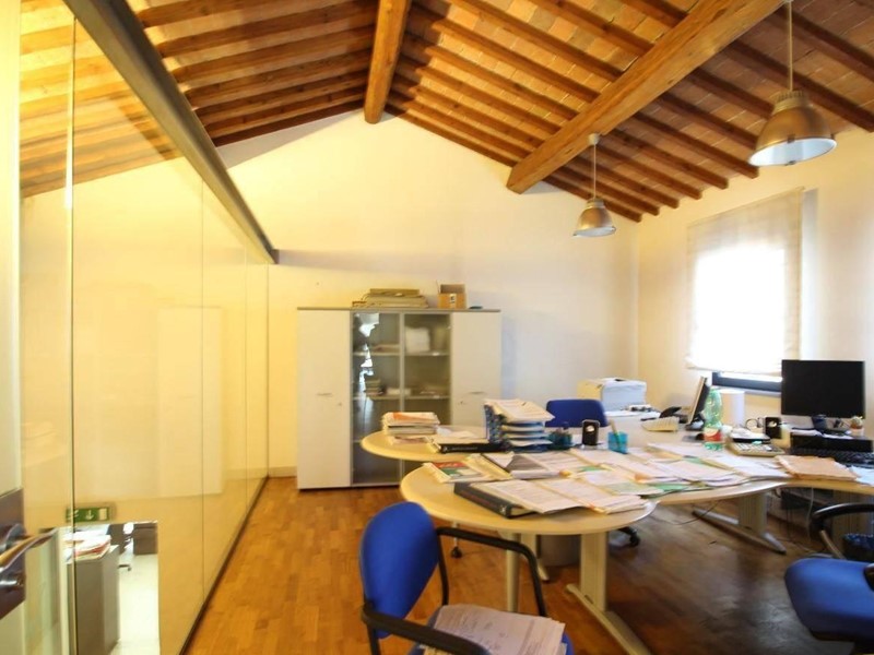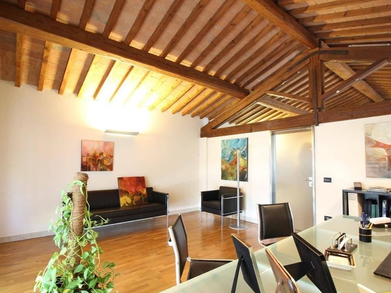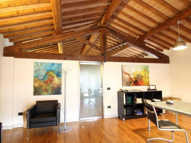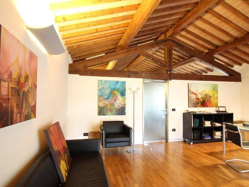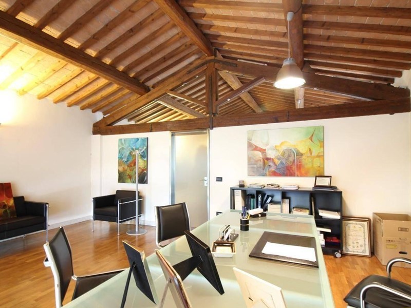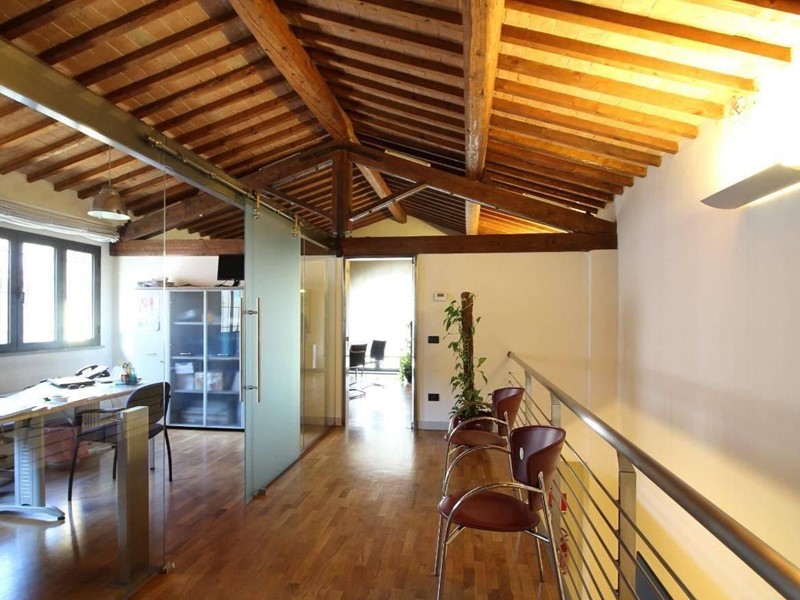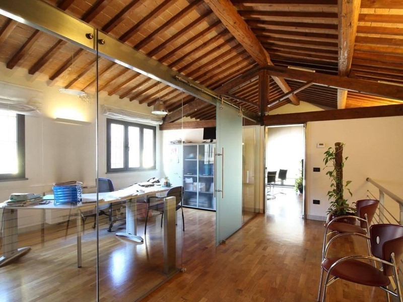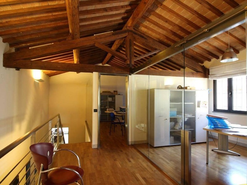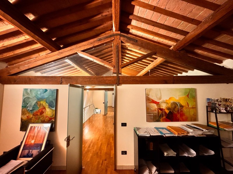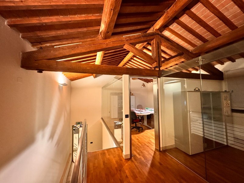 Una moderna scala interna conduce al piano superiore (circa 70 mq), caratterizzato da un suggestivo tetto con travi a vista e pavimento in parquet. Qui trovano spazio tre uffici indipendenti, perfetti per attività direzionali o sale riunioni.