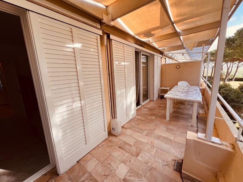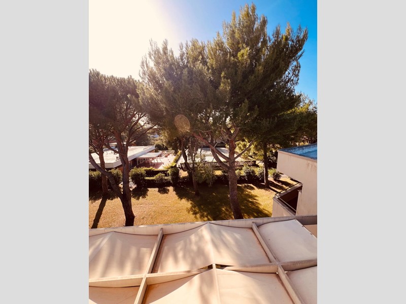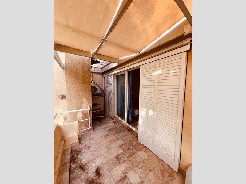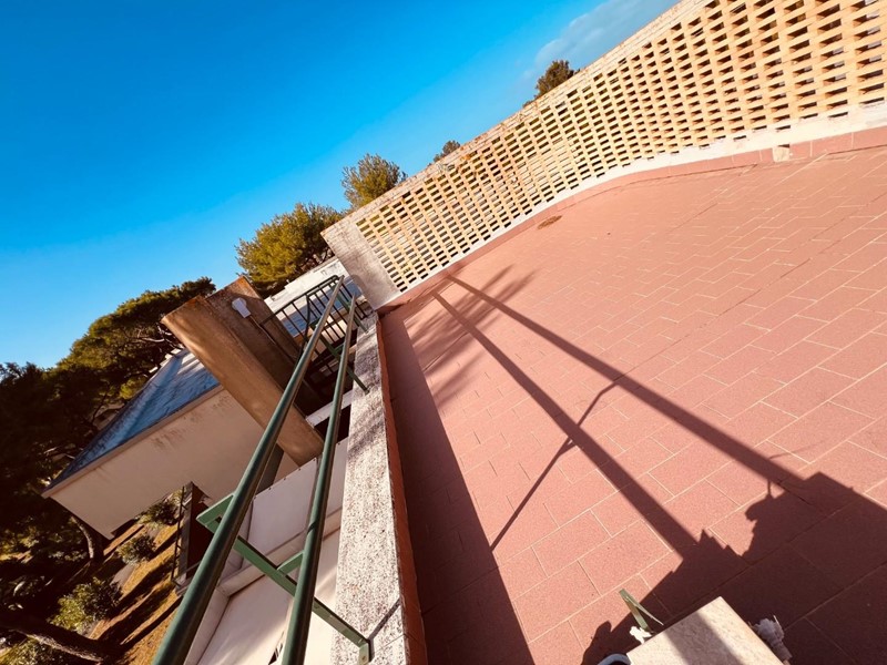 La terrazza principale, dotata di copertura mobile, offre una vista panoramica sulla piscina condominiale sottostante. Attraverso una scala a chiocciola, è possibile accedere al solarium situato sul tetto dell’edificio.