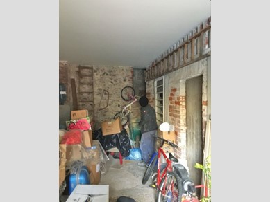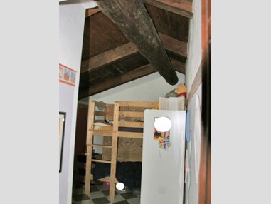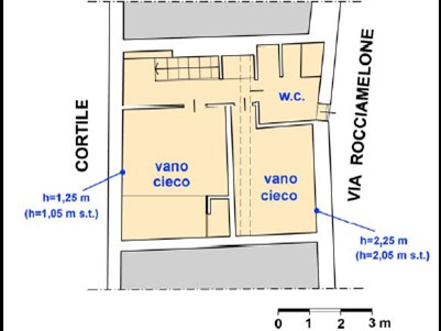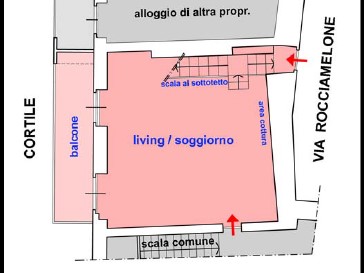 - piena proprietà di alloggio di civile abitazione posto al piano primo (2° f.t.), attualmente costituito da unico vano con area cottura e da balcone sul lato cortile- uso perpetuo ed esclusivo di porzione di sottotetto posta al piano superiore e collegata all'alloggio al piano sottostante da scala interna e costituita da due camere da letto ed un bagno,- nel corpo di fabbrica confinante piena proprietà di cantina posta al piano terra