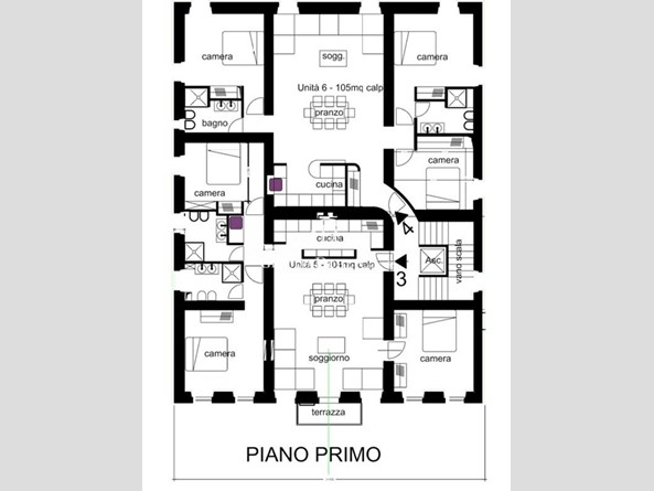 La zona notte si compone di due camere matrimoniali e una terza camera singola o studio, oltre a due bagni completi e una comoda lavanderia/ripostiglio.