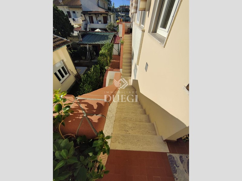 Attraverso cancello pedonale si entra nella resede a comune dove troviamo una scala estrena privata che ci conduce direttamente alla portone blindato di ingresso dell'abitazione al piano primo.