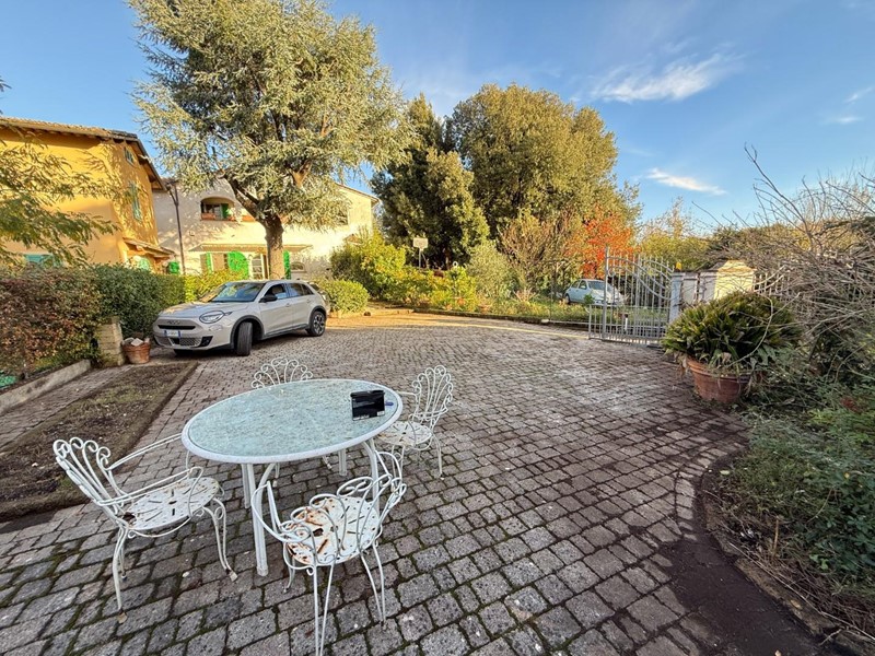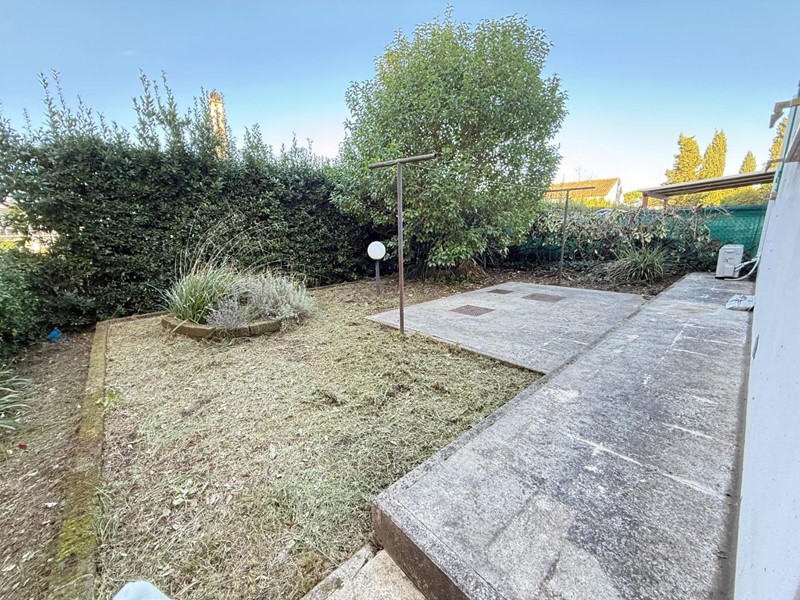 La proprietà è completamente recintata e si accede tramite un grande cancello carrabile automatico, che introduce a una zona esterna pavimentata, perfetta per parcheggiare l’auto. Un vialetto piastrellato conduce all’ingresso dell’abitazione, costeggiato da giardino curato e siepi perimetrali.