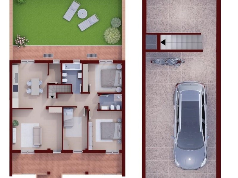 ● ingresso su ampio soggiorno e cucina abitabile con ripostiglio e accesso diretto al giardino.