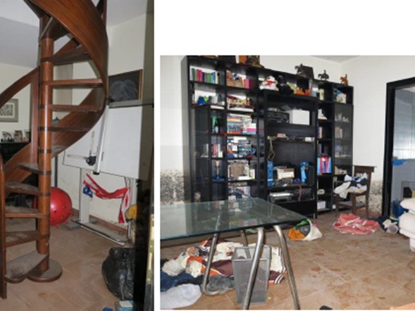 - al piano rialzato una cucina aperta su ampio soggiorno, due camere, due disimpegni e due servizi igienici, un ripostiglio/lavanderia, un balcone/terrazzo ed una scala a chiocciola che lo collega al piano sottostante seminterrato; si evidenzia che in adiacenza al terrazzo, è stato aperto un varco di collegamento su una parete di divisione con una loggia, tale spazio aperto non risulta di pertinenza dell’appartamento in esame.