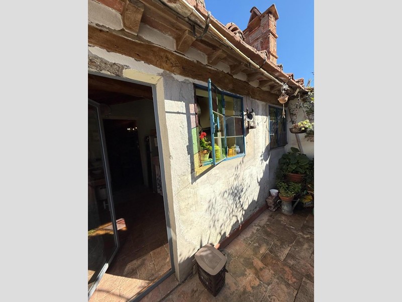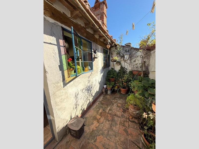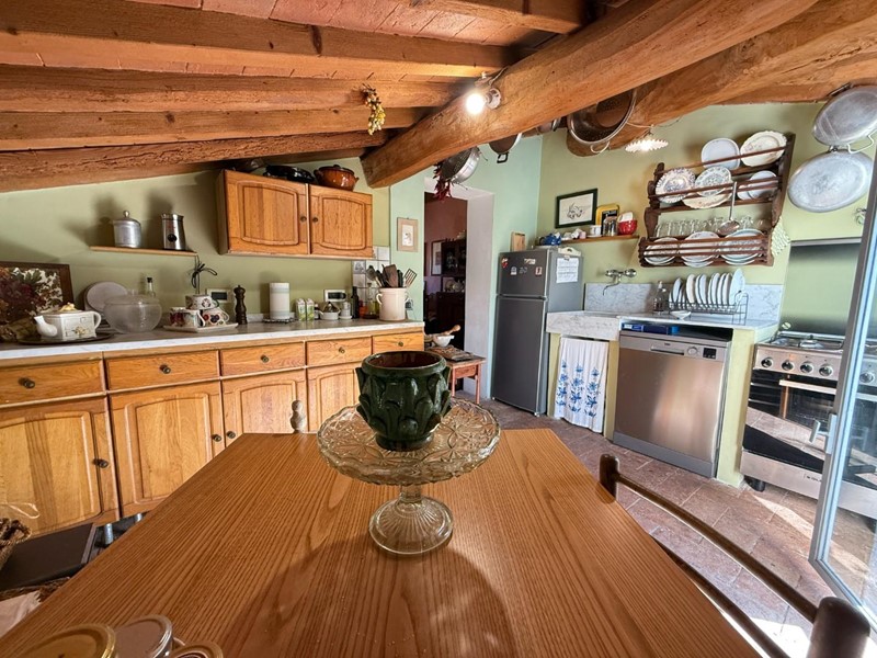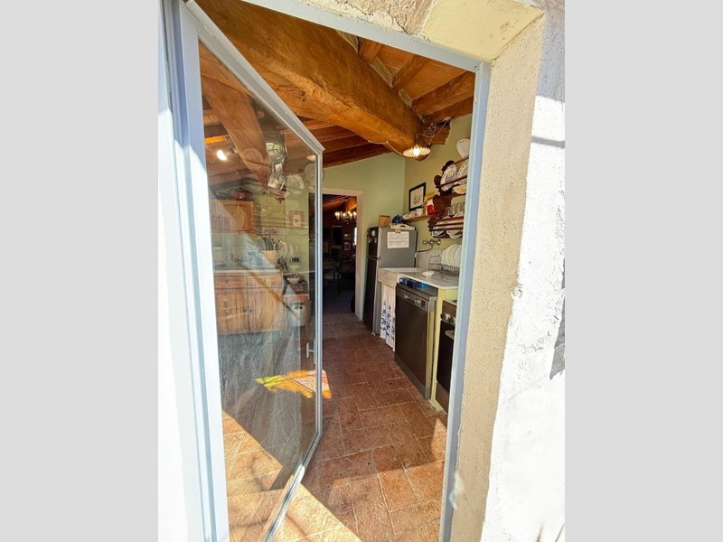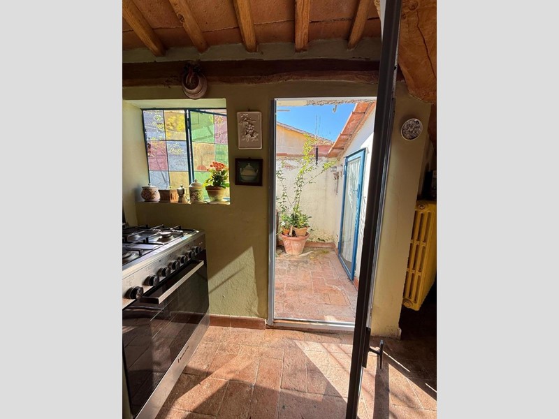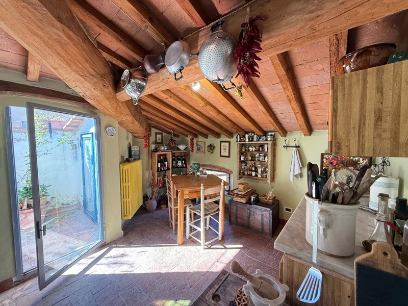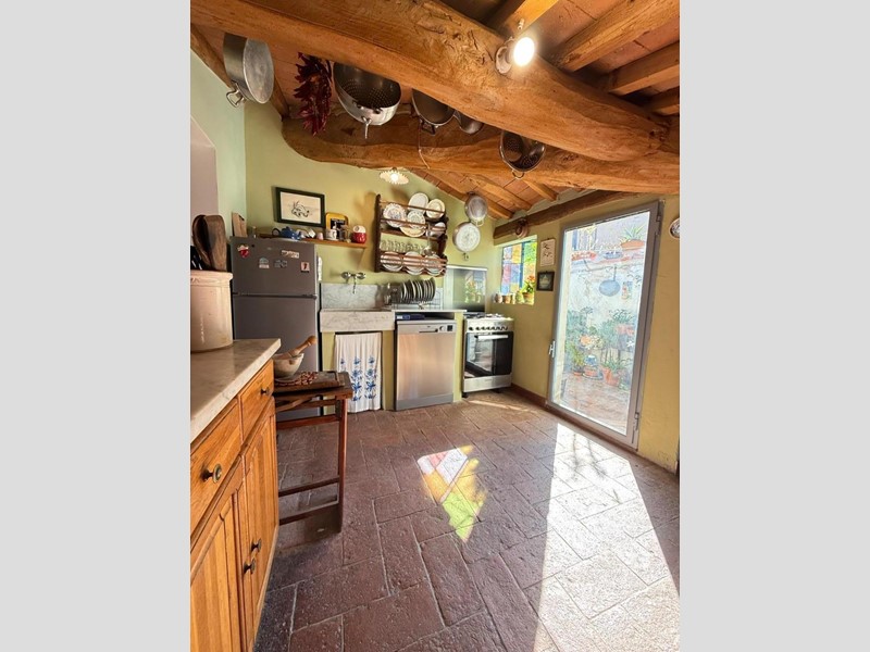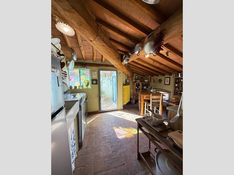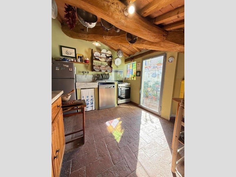 La cucina abitabile, anch’essa con travi a vista, conduce a un terrazzino panoramico di circa 7 mq: un piccolo angolo di paradiso dove fare colazione al mattino o sorseggiare un bicchiere di vino al tramonto, godendosi la quiete del borgo.