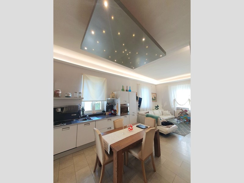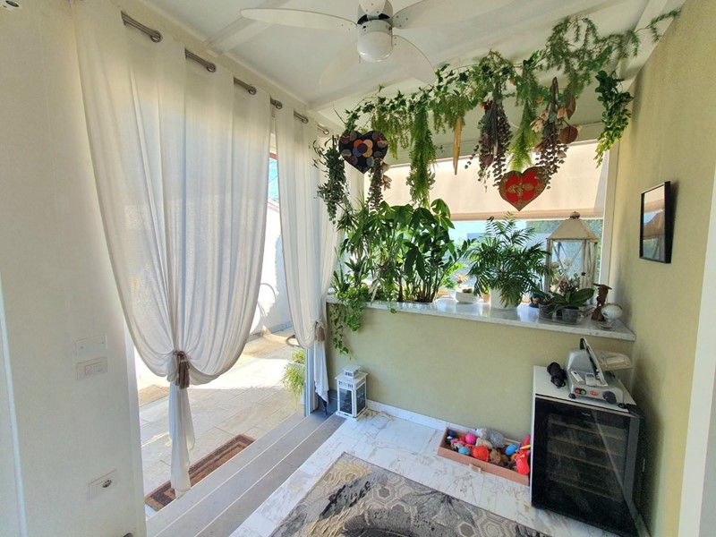 La Villa si compone al piano terra rialzato da ingresso, ampia e luminosa zona giorno di tipo ''open space'' dotata di soggiorno, zona pranzo con cucina a vista e caminetto. Dalla cucina si accede alla bellissima veranda coperta che affaccia direttamente sul giardino e dotata di chiusure in pvc trasparente, motorizzate e con telecomando. Proseguendo all'interno della Villa, dal disimpegno troviamo un comodo ripostiglio, il bagno principale con vasca angolare e due camere matrimoniali di cui una con bagno privato dotato di doccia.