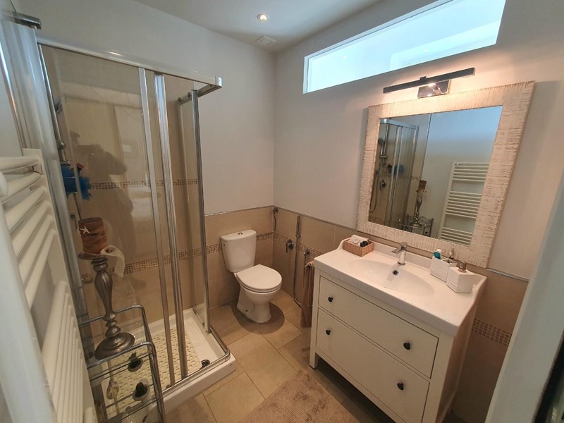 La dependance anch'essa ristrutturata misura circa 90 mq e si sviluppa al solo piano terra. Anch'essa è molto curata, dispone di riscaldamento a pavimento, con il pregiato tetto in legno lamellare a vista pitturato bianco per una maggiore luminosità. Si compone da pergolato, ingresso, zona pranzo con cucina a vista, sala relax con tv e ampia vetrata direttamente sul giardino. Dal disimpegno troviamo la camera matrimoniale una cameretta e il bagno con doccia.
