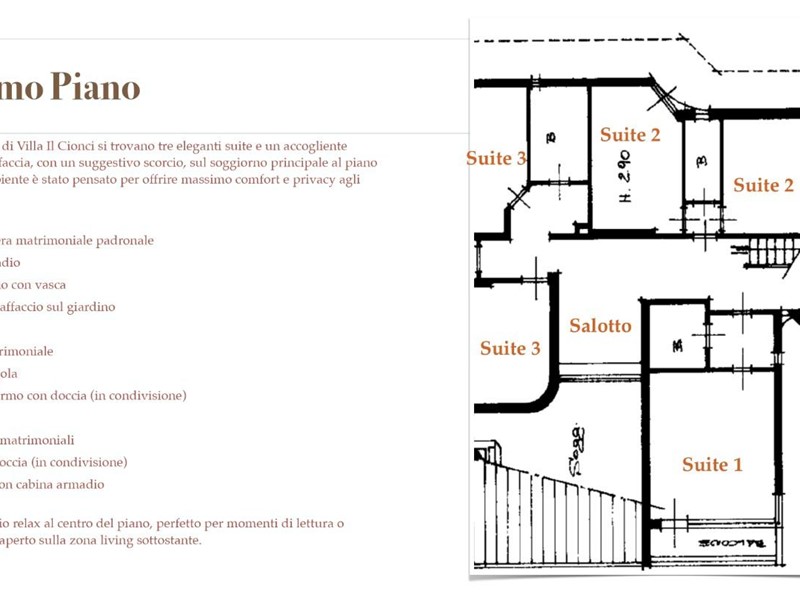 • Ampia camera matrimoniale padronale, Cabina armadio, Sala da bagno con vasca, Balcone con affaccio sul giardino