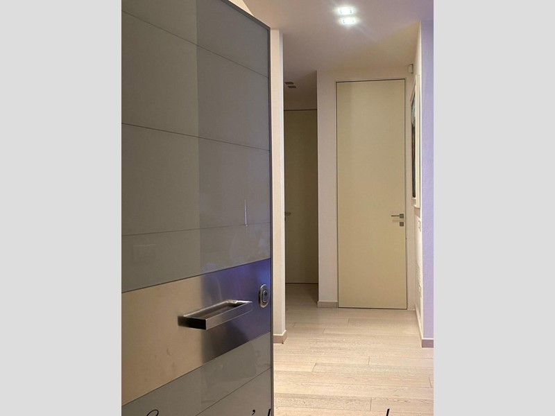 Porte Tre-P a tutta altezza con maniglie olivari. Impianto con pannelli radianti Pavimento in parquet di rovere