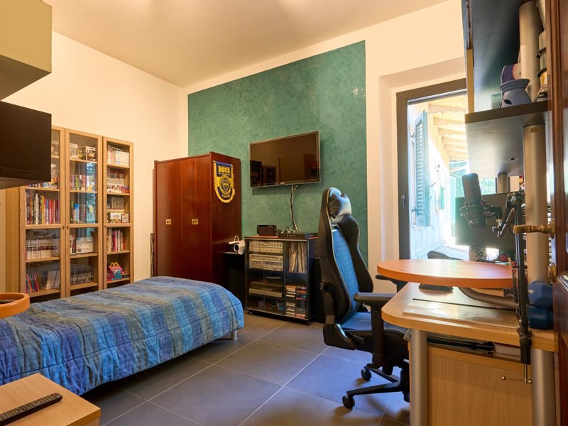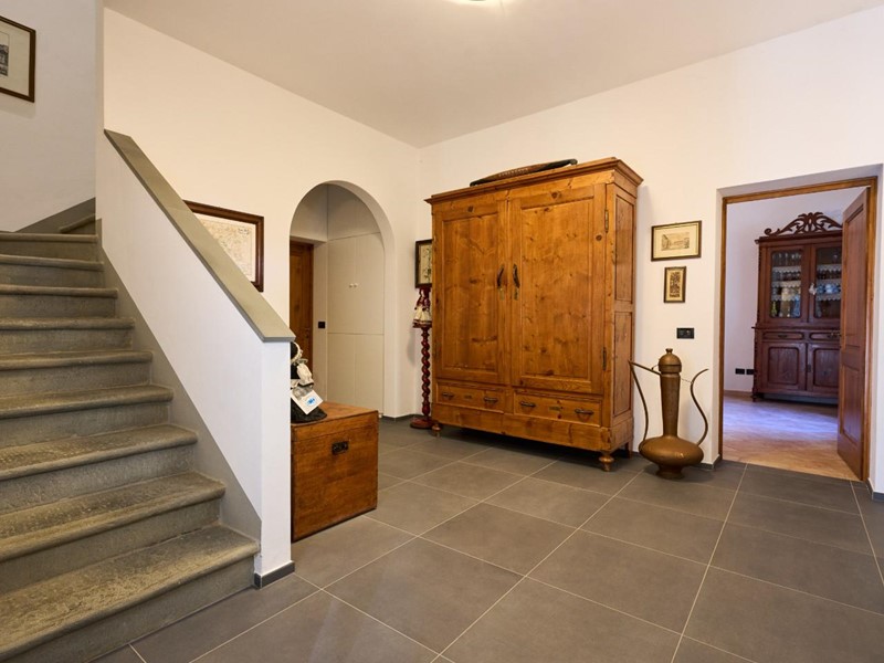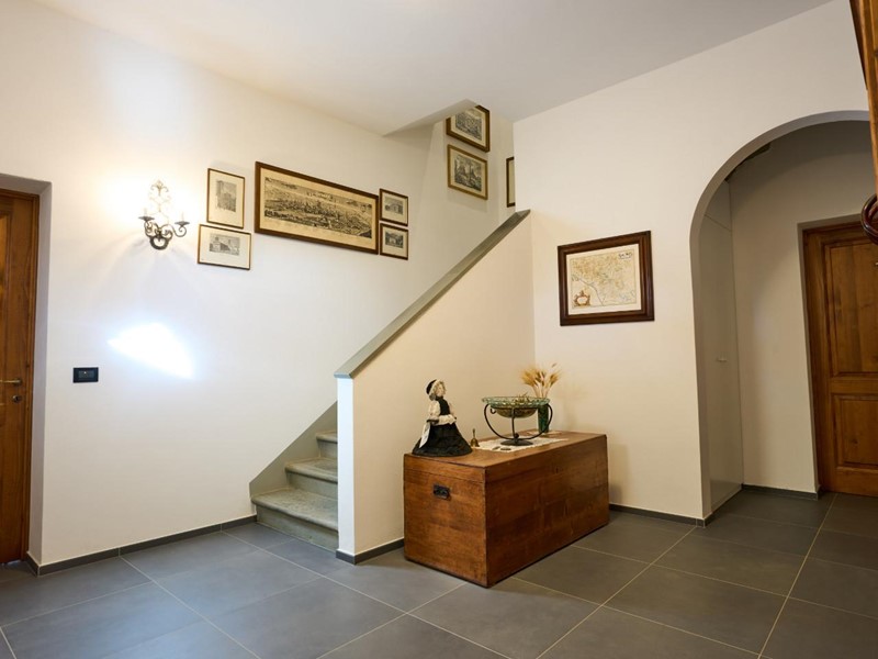 Gli interni, caldi e accoglienti, si distinguono per le finiture tipiche toscane: travi a vista, pavimenti in cotto e pietra naturale. Dal salone principale si accede al giardino privato e al loggiato esterno, perfetto per momenti di relax o degustazioni al tramonto.