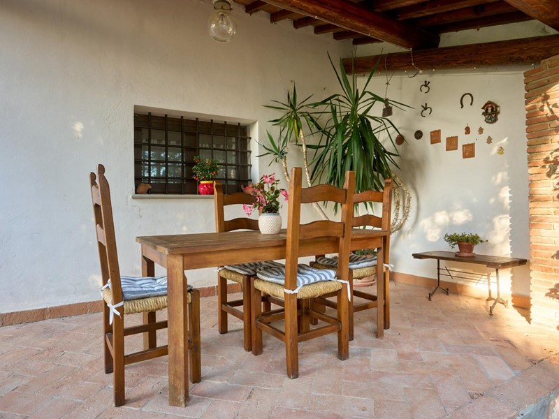 Gli interni, caldi e accoglienti, si distinguono per le finiture tipiche toscane: travi a vista, pavimenti in cotto e pietra naturale. Dal salone principale si accede al giardino privato e al loggiato esterno, perfetto per momenti di relax o degustazioni al tramonto.