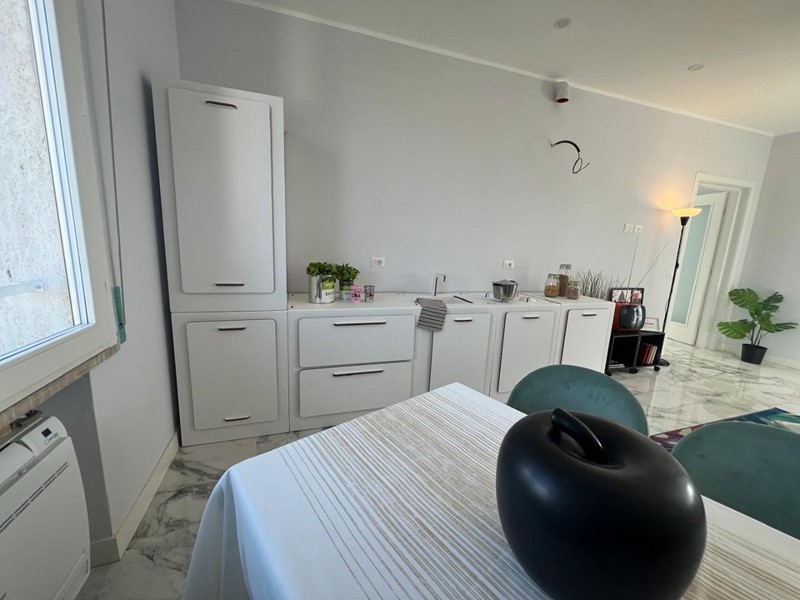 La zona giorno, luminosa e accogliente, si apre su un soggiorno con cucina a vista e accesso diretto alla terrazza. La zona notte comprende una camera matrimoniale, una camera doppia e un bagno principale finestrato, oltre a un secondo bagno di servizio dedicato alla zona giorno.