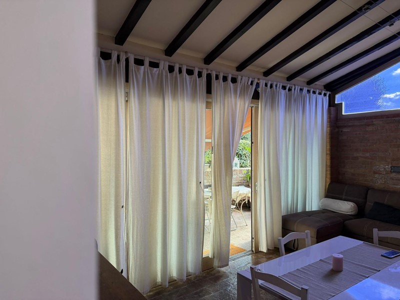 Salotto suggestivo ricavato nel porticato completamente vetrato, con ampia porta scorrevole a tutta parete che dona continuità tra interno ed esterno, creando un’atmosfera unica di luce e trasparenze.