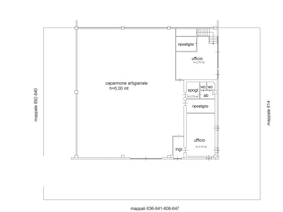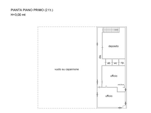 Fabbricato industriale dotato di piazzale esterno per carico/scarico merci e parcheggio funzionale adiacente. Si eleva per due piani fuori terra, collegati internamente da una scala, ed è così composto: al piano terra l’area destinata a magazzino/area produttiva, ingresso con corridoio, due uffici, due ripostigli ed uno spogliatoio con due wc al suo interno, al piano primo è presente un corridoio di disimpegno, un deposito, due uffici, un wc con antibagno ed un ripostiglio.
