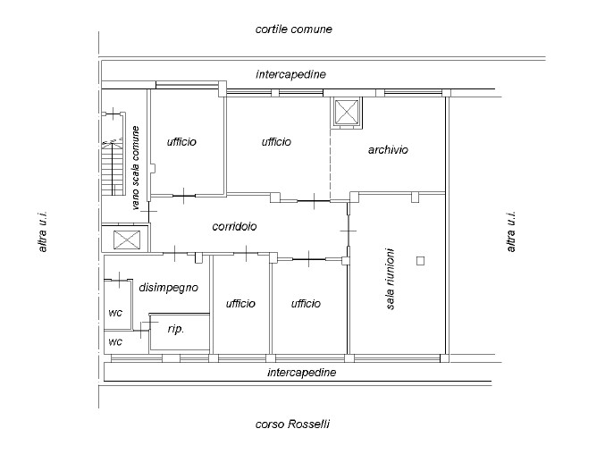 - locale ad uso ufficio/studio privato al piano seminterrato, graficamente rappresentato in corpo unico con la restante adiacente porzione del piano, nella planimetria del relativo piano allegata al Regolamento di condominio, composto di ingresso, sei vani principali ad uso ufficio/archivio/sala riunioni e quattro vani accessori per servizi igienici/disimpegno/ripostiglio,