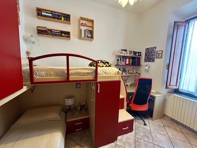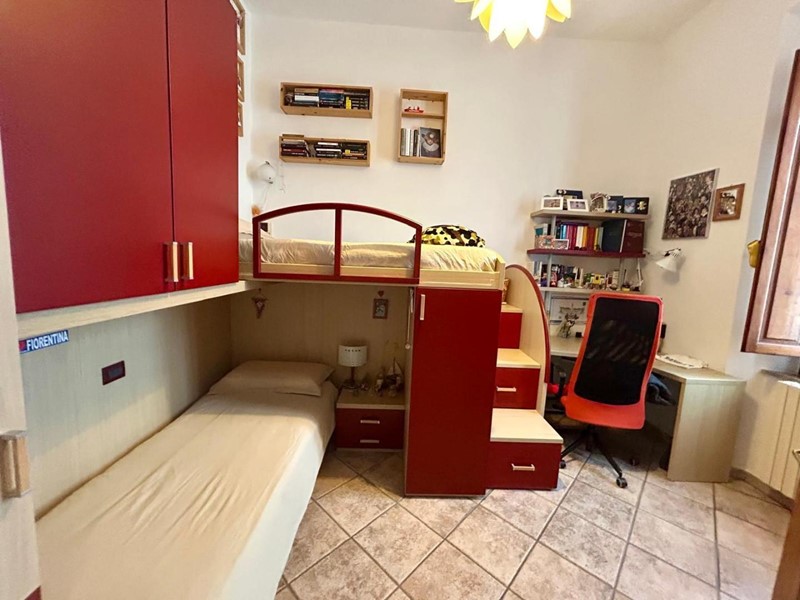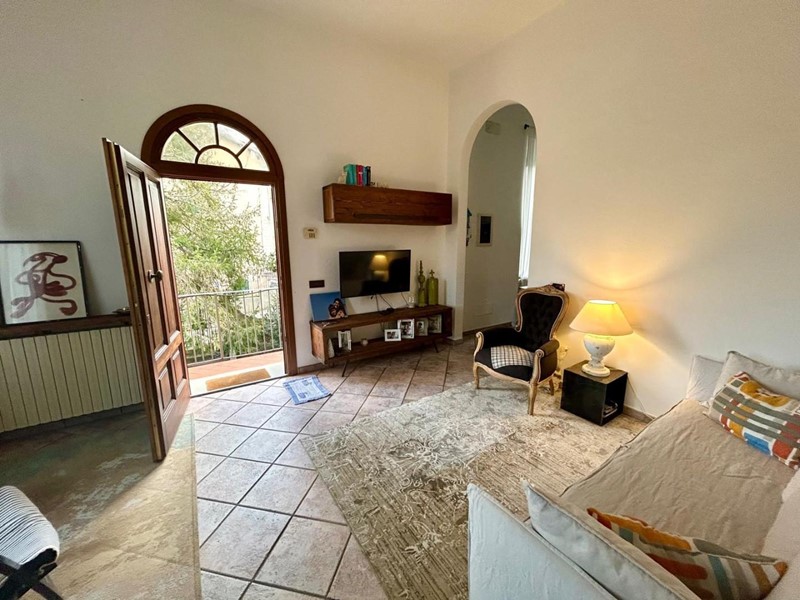 L'appartamento è composto da soggiorno con caminetto, cucina, bagno, 2 camere oltre terrazza angolare, giardino e ampio locale accessorio di circa mq 80 posto al piano seminterrato con accesso carrabile.