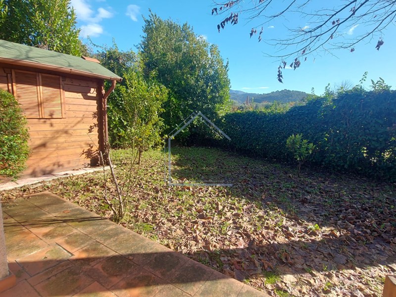 La proprietà è valorizzata da un magnifico giardino piantumato che circonda la casa su tre lati, offrendo ampi spazi per il relax e attività all'aperto. All'ingresso, un gradevole loggiato crea una zona d'ombra ideale per mangiare o riposare al fresco. Gli spazi esterni includono anche una comoda casetta di legno per il ricovero attrezzi e un pilozzo in ceramica sul retro.