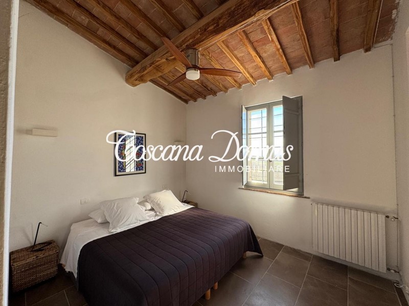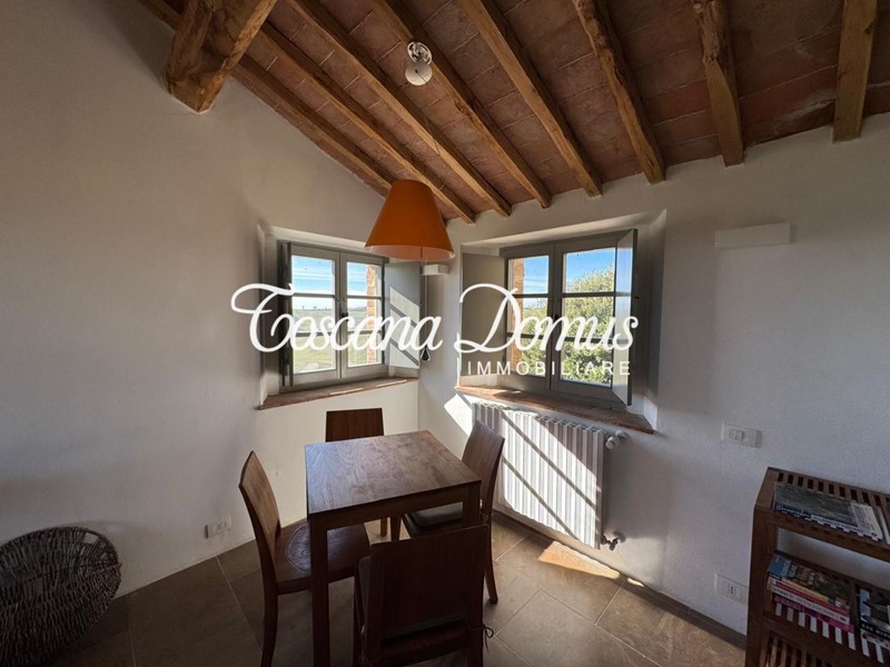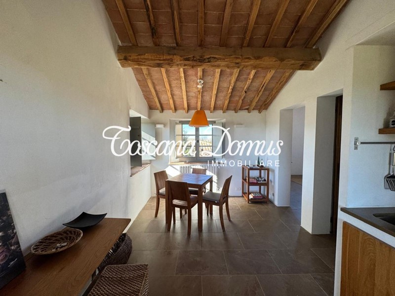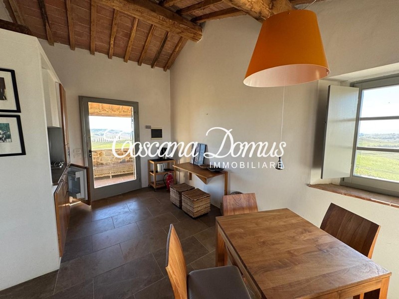 Soggiorno con cucinotto, due camere matrimoniali e due bagni, terrazza coperta con vista fino ad arrivare al Monte Amiata.