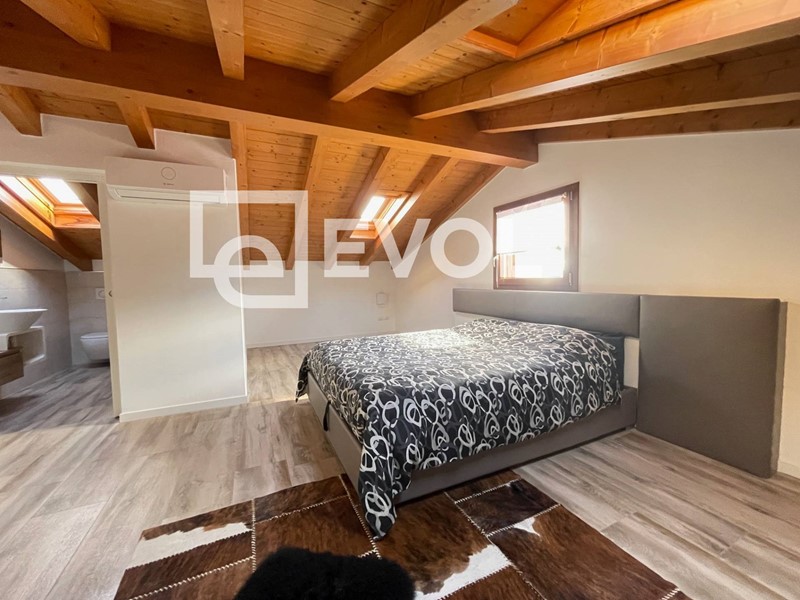 Il secondo piano, di circa 26 mq, è oggi organizzato come ampia camera padronale con travi a vista, con bagno dedicato dalle finiture raffinate, offrendo un ambiente riservato e versatile.