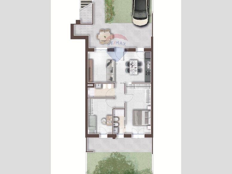 * LUMINOSO TRILOCALE al piano terra di circa 77 mq commerciali, composto da soggiorno con angolo cottura di circa 22 mq, camera , cameretta, doppi servizi, giardino fronte-retro di circa 60 mq perfetto per cene allaperto. Posto auto scoperto.