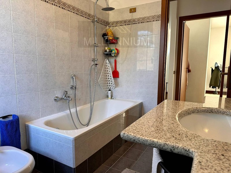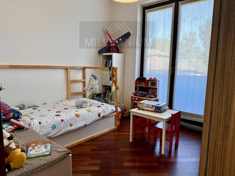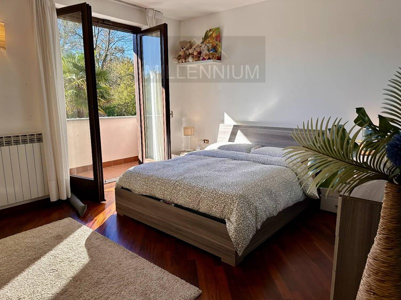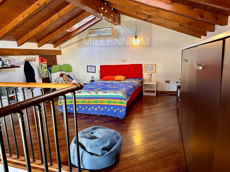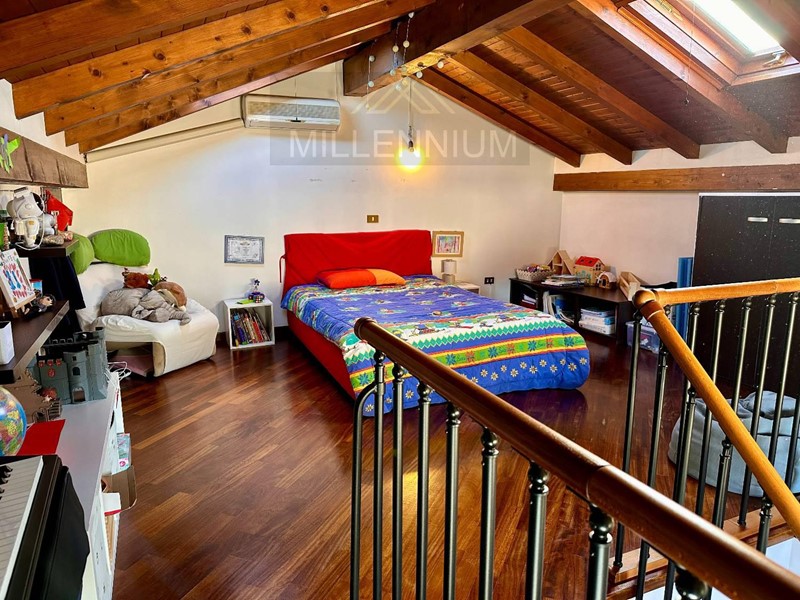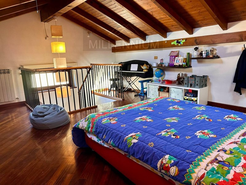 La zona notte, al primo piano, comprende due spaziose camere da letto, entrambe dotate di balcone, e un bagno con vasca. A completamento, una mansarda/locale hobby o stanza ospiti, ben rifinita e dotata di impianto di riscaldamento e raffrescamento.