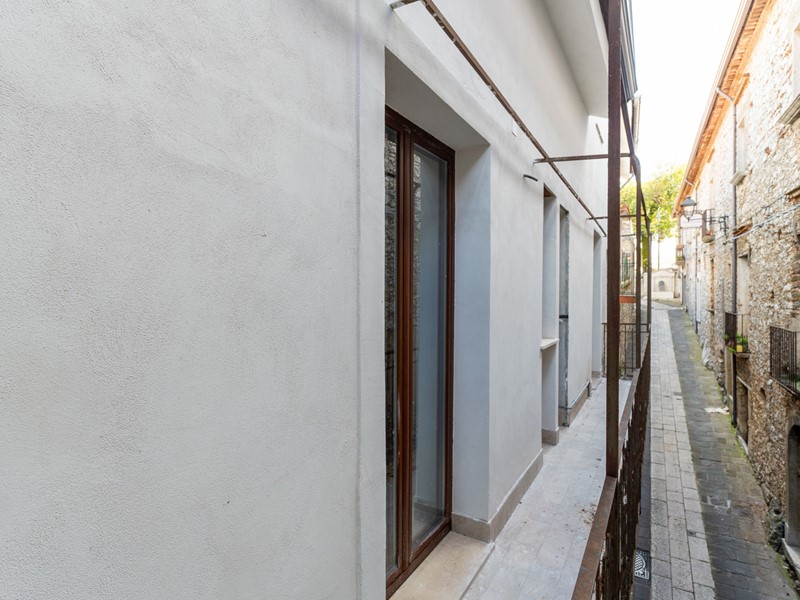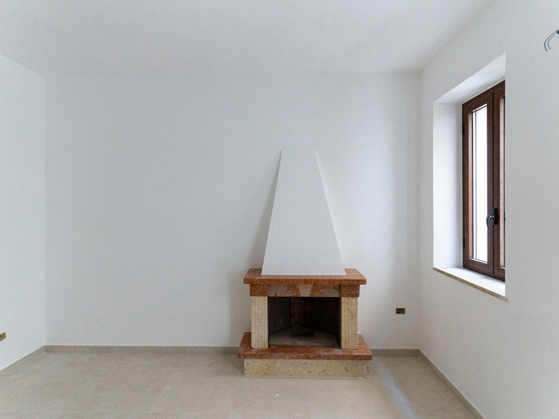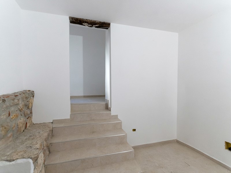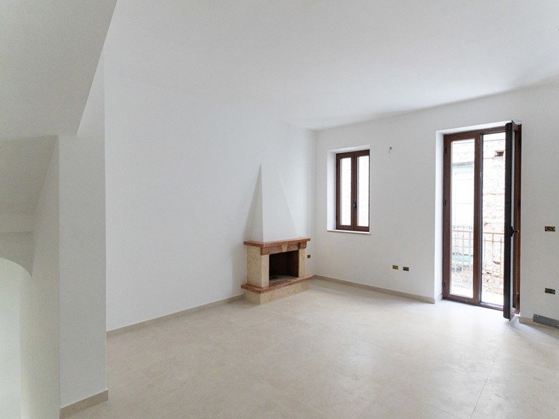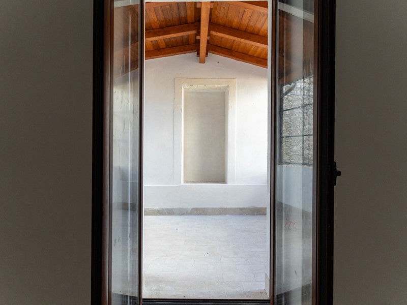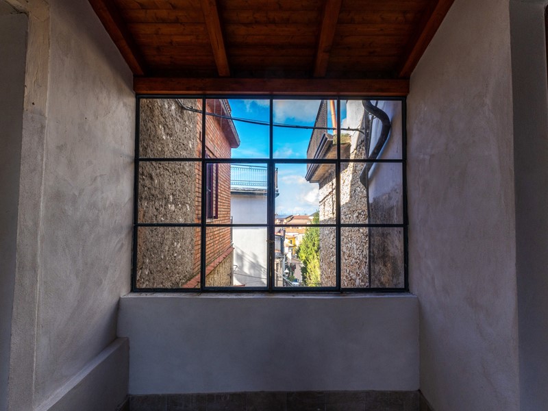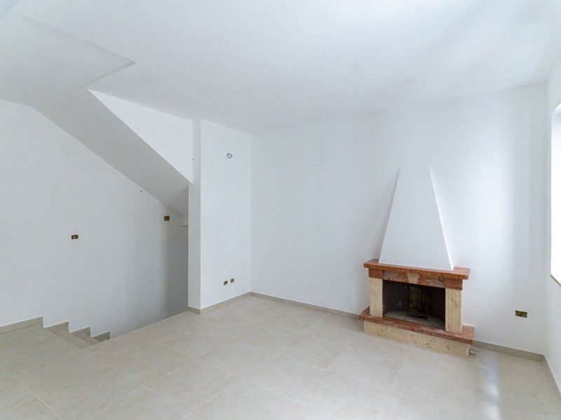 L'ingresso, accogliente e luminoso, ti accompagna verso il piano superiore dove si apre la zona living: un openspace con camino, perfetto per le serate d'inverno o per una colazione davanti alla lunga balconata che si affaccia sui tetti del borgo.