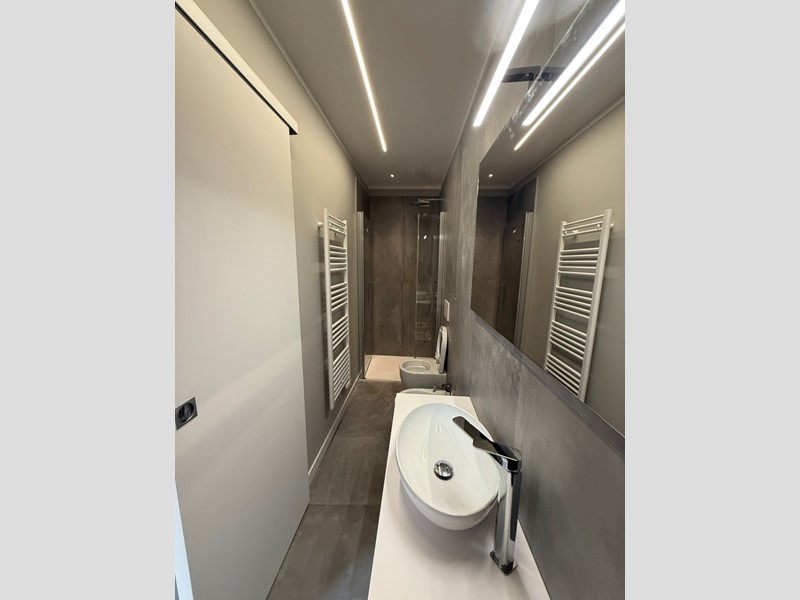 I bagni sono entrambi rivestiti di piastrelle color grigio cemento 60 x 120 e piastrelle rivestimento 60 x 60 sempre grigio cemento