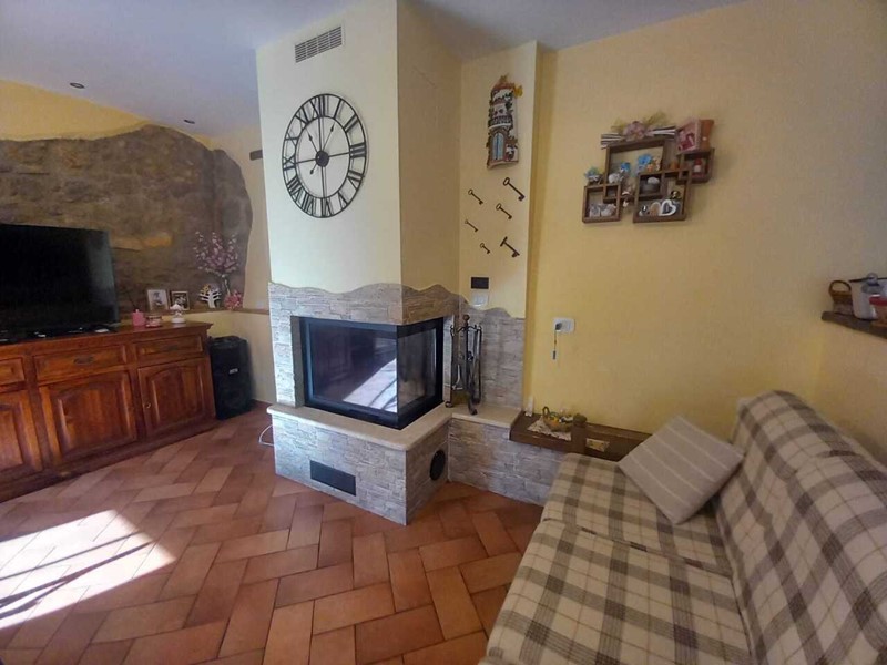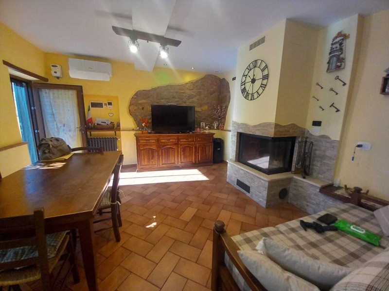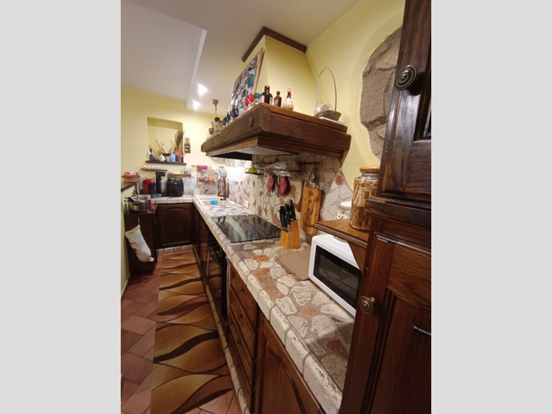 L’ingresso si apre su un ampio salone con cucina a vista in muratura, perfetto per chi ama vivere la zona giorno in modo conviviale.