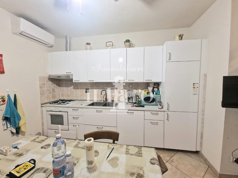 L'abitazione è così composta: Entrando ci accoglie una bella zona giorno molto luminosa con angolo cottura e accesso alla terrazza di ampia metratura.
