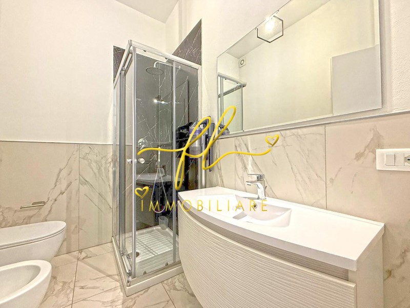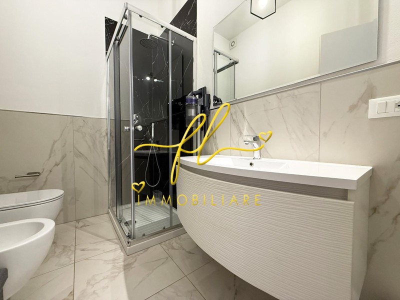 Proseguendo troviamo il bagno cieco con aeratore e box doccia, un’altra sala dove poter ricavare comodamente la terza camera e la zona pranzo con una grande cucina.
