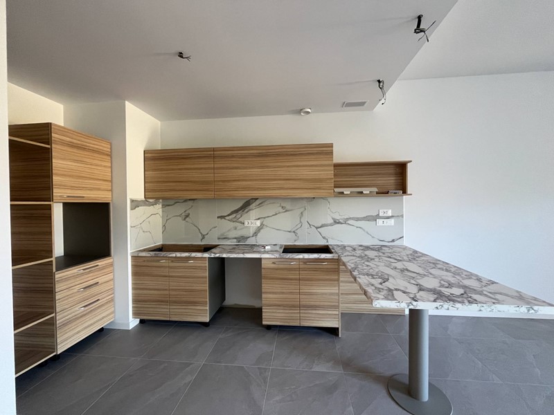 Limmobile si apre su un ingresso che conduce alla luminosissima zona giorno, già arredata con cucina su misura, dotata di portafinestra con accesso al terrazzo abitabile.