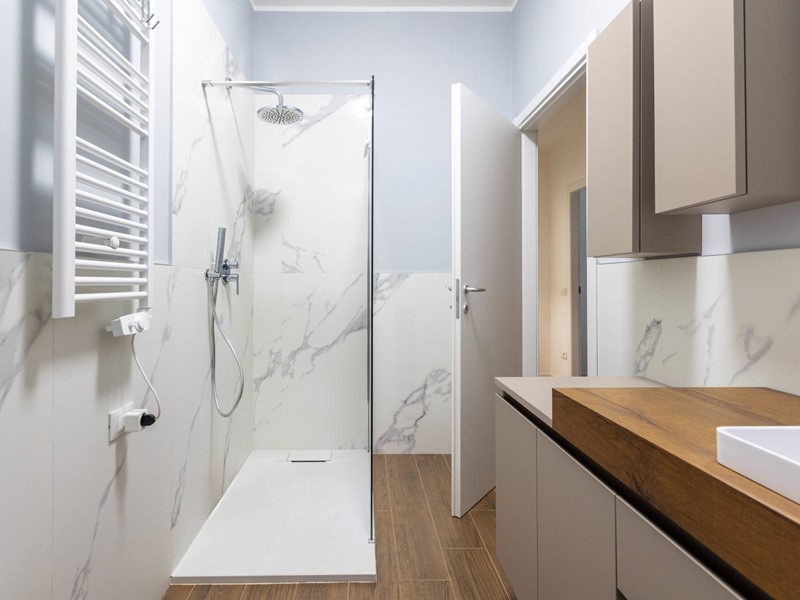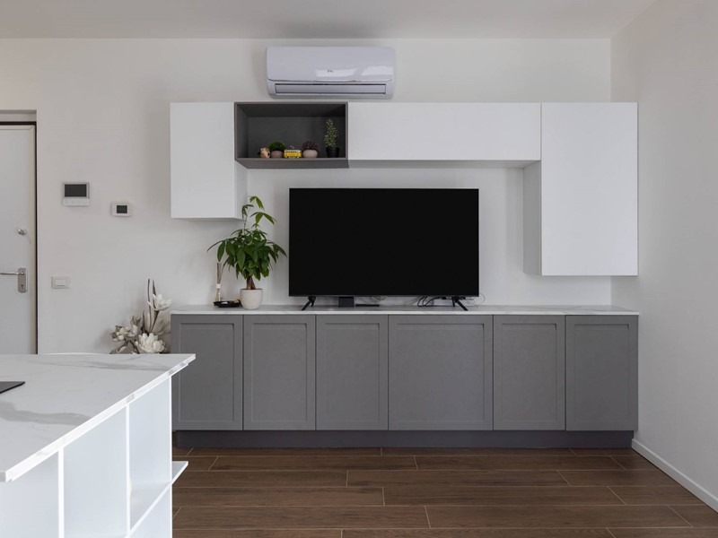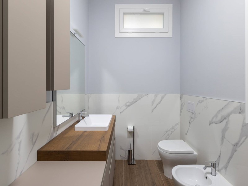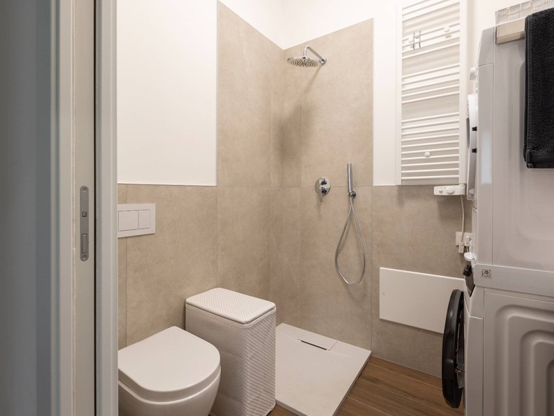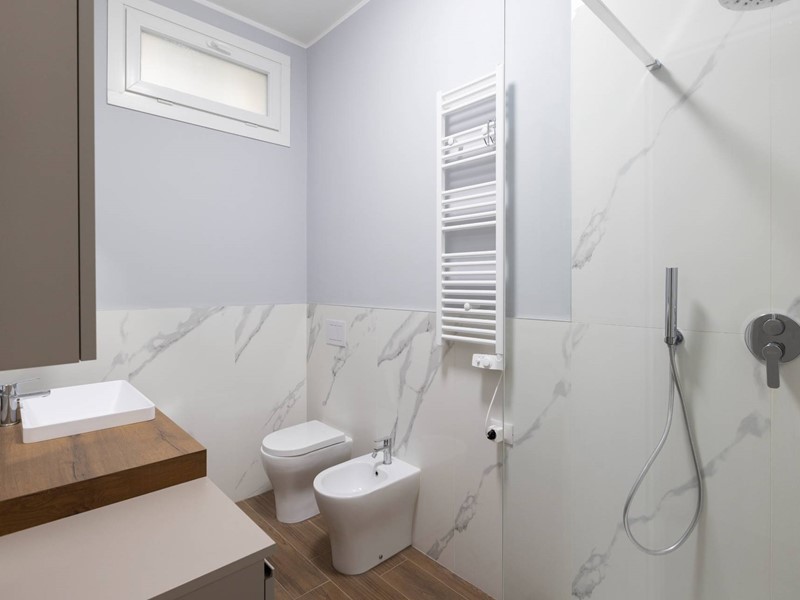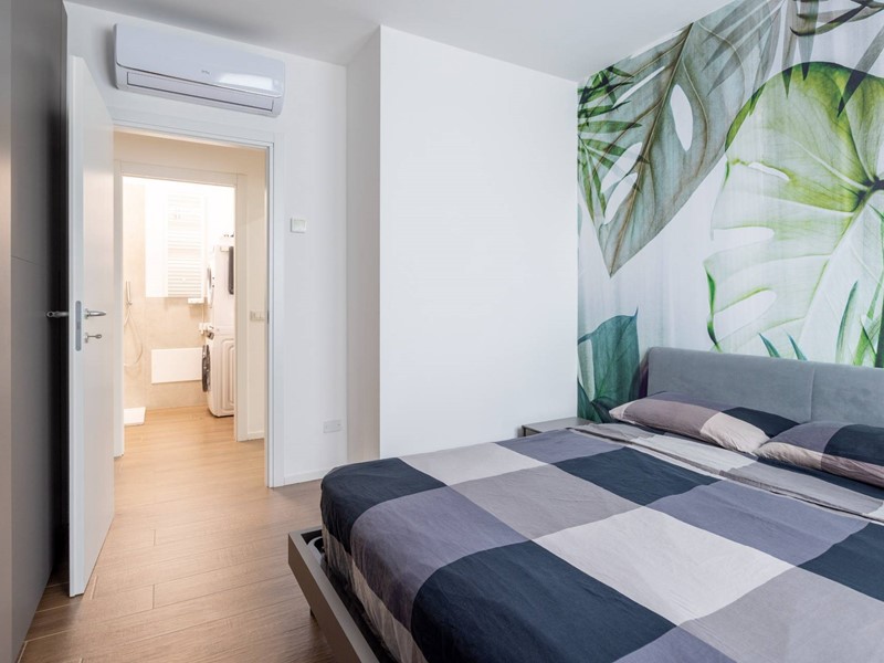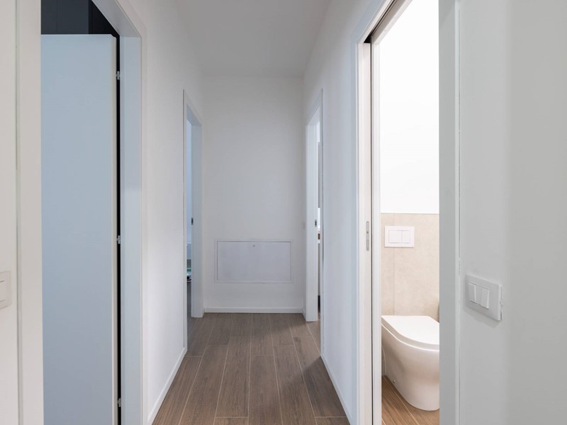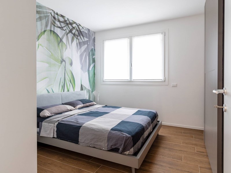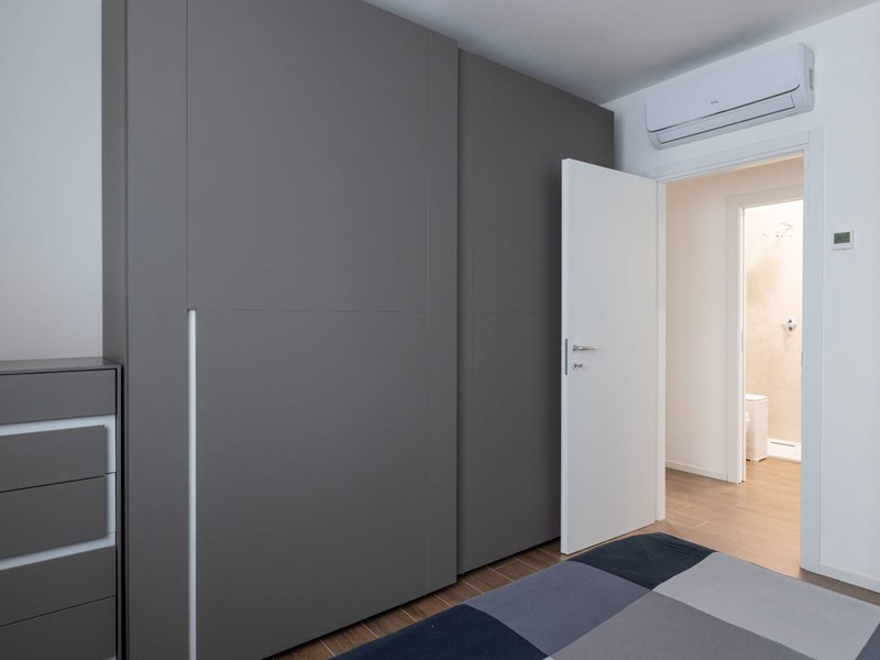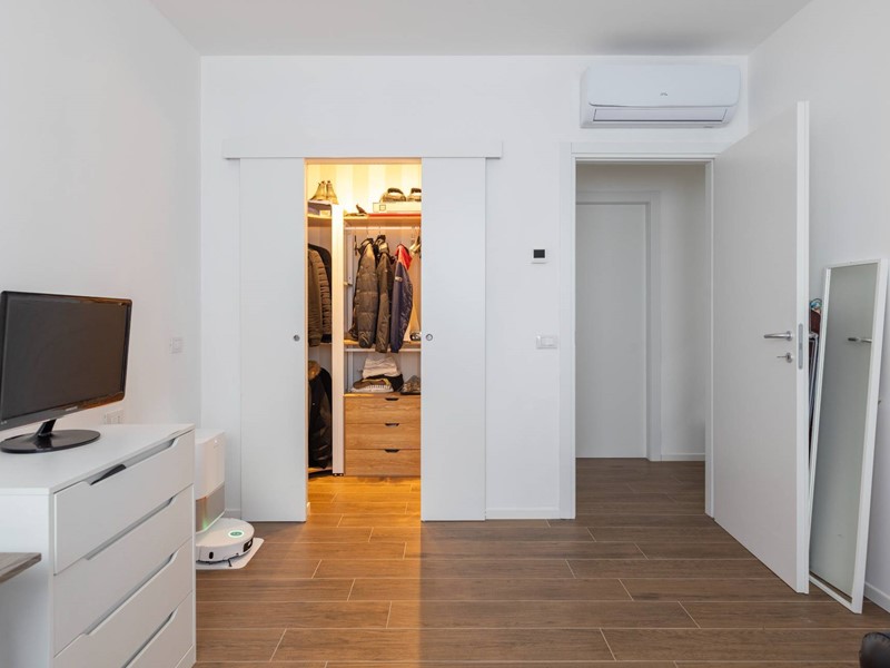 La zona notte comprende due camere da letto, una delle quali dotata di cabina armadio. Le finiture interne sono di qualità, con pavimentazioni in gres porcellanato effetto legno che conferiscono continuità estetica. Limmobile è dotato di riscaldamento autonomo a pavimento e impianto di raffrescamento ad aria, mentre la presenza di pannelli fotovoltaici dedicati contribuisce a mantenere contenuti i costi di gestione.