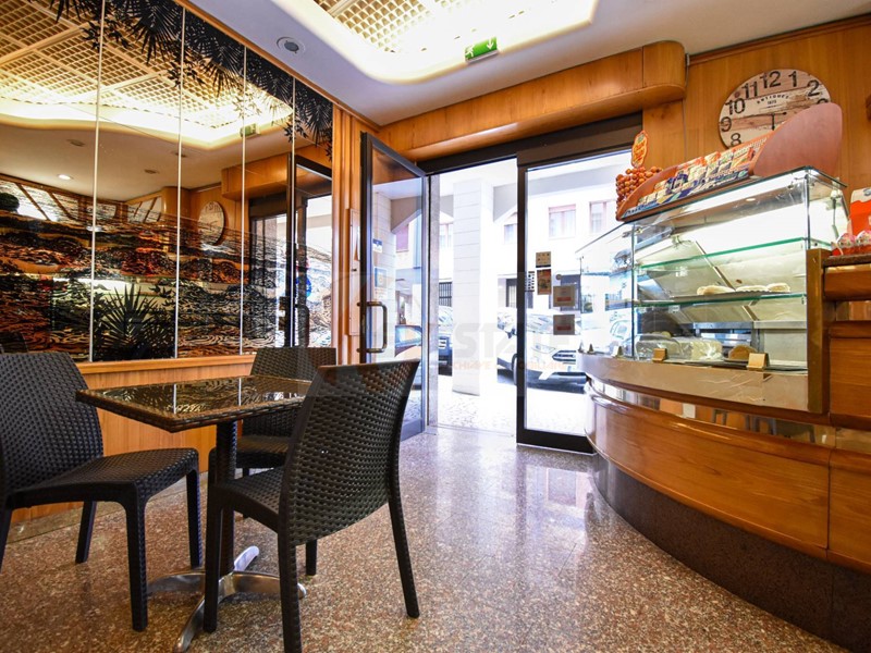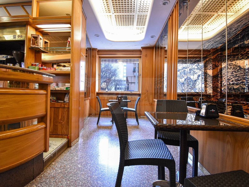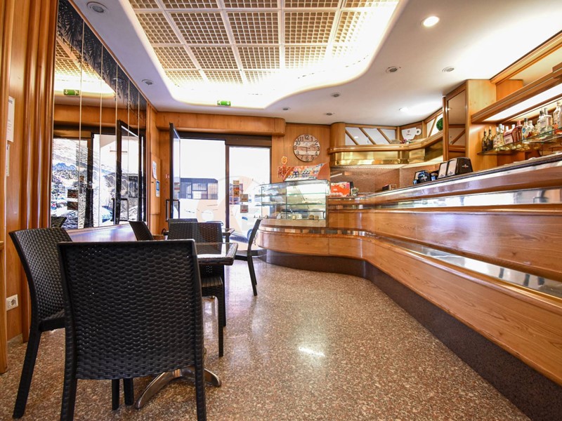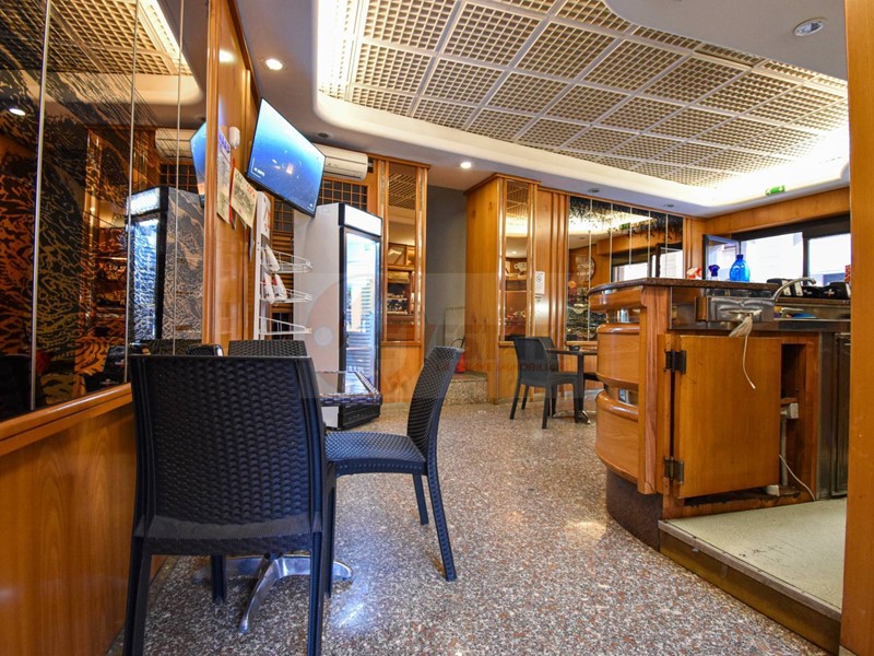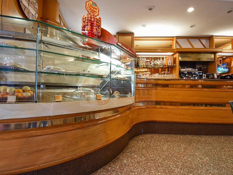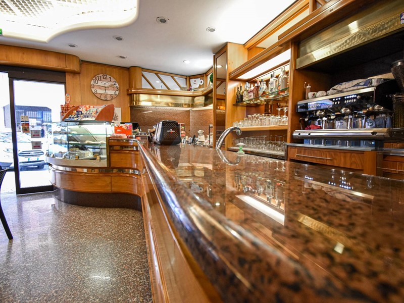 Il locale si sviluppa su due livelli. Al piano terra, con accesso diretto dalla strada, si trova larea principale del bar, caratterizzata da un grande bancone in legno, zona tavolini interni, ampi spazi per frigoriferi e attrezzature. Allesterno, sotto i portici del palazzo, sono disponibili ulteriori spazi per tavolini al servizio dei clienti.
