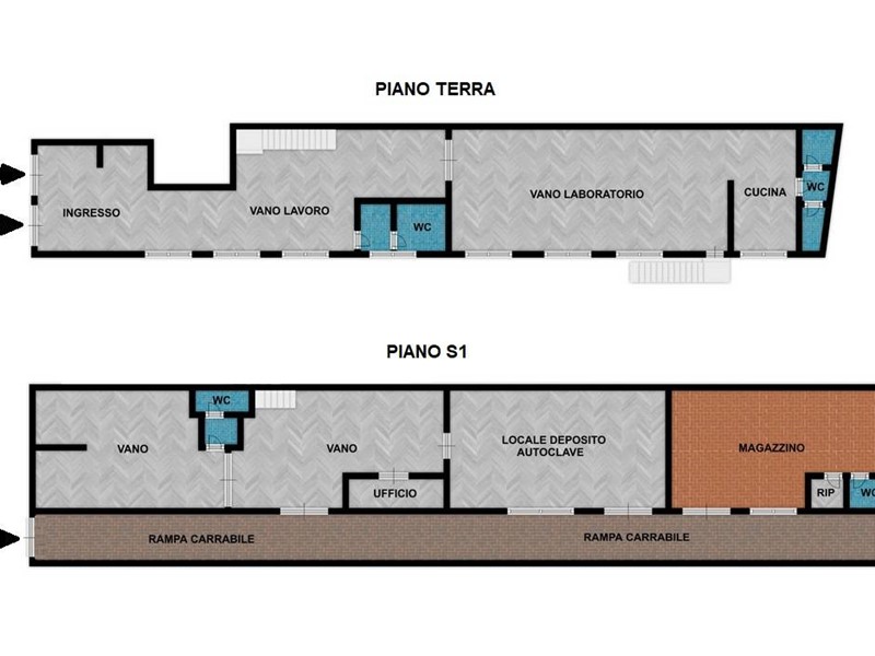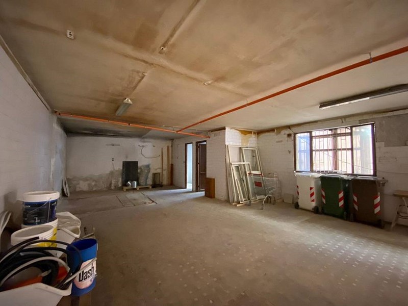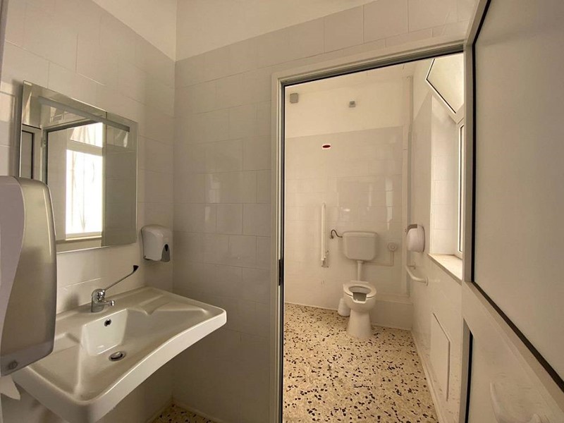 Attualmente la proprietà è così suddivisa: ingresso da porta automatica, al piano rialzato, su ampio vano lavoro con antibagno e bagno per disabili; vano laboratorio con angolo cucina e spogliatoio/ wc per il personale.